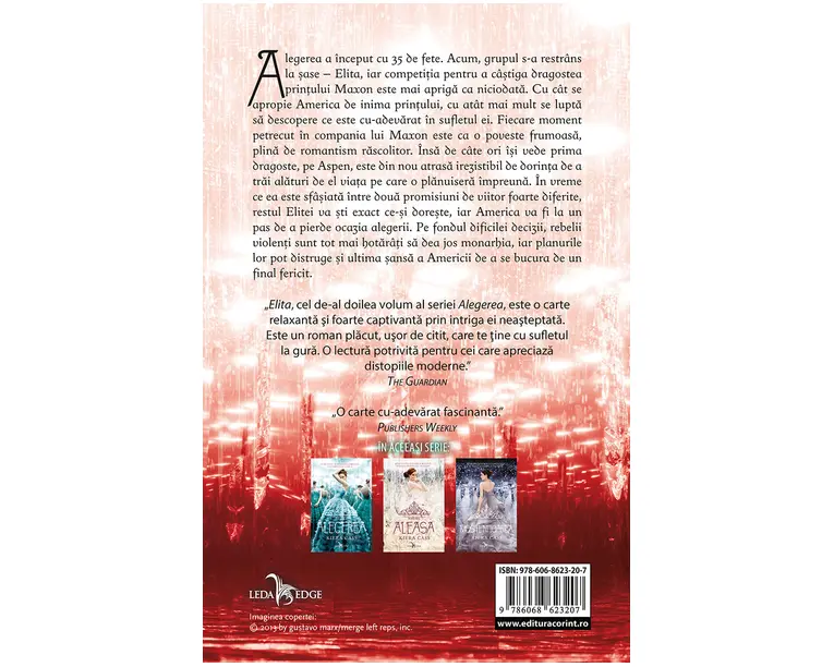 Alegerea a început cu 35 de fete. Acum, grupul s-a restrâns la şase – Elita, iar competitia pentru a câştiga dragostea printului Maxon este mai apriga ca niciodata. Cu cât se apropie America de inima printului, cu atât mai mult se lupta sa descopere ce este cu-adevarat în sufletul ei. Fiecare moment petrecut în compania lui Maxon este ca o poveste frumoasa, plina de romantism rascolitor. Însa de câte ori îşi vede prima dragoste, pe Aspen, este din nou atrasa irezistibil de dorinta de a trai alaturi de el viata pe care o planuisera împreuna. În vreme ce ea este sfâsiata între doua promisiuni de viitor foarte diferite, restul Elitei va sti exact ce-si doreste, iar America va fi la un pas de a pierde ocazia alegerii. Pe fondul dificilei decizii, rebelii violenti sunt tot mai hotarâti sa dea jos monarhia, iar planurile lor pot distruge si ultima sansa a Americii de a se bucura de un final fericit. „Elita, cel de-al doilea volum al seriei Alegerea, este o carte relaxanta si foarte captivanta prin intriga ei neasteptata. Este un roman placut, usor de citit, care te tine cu sufletul la gura. O lectura potrivita pentru cei care apreciaza distopiile moderne.” THE GUARDIANn„O carte cu-adevarat fascinanta.” PUBLISHERS WEEKLY Produsul cu denumirea Elita (vol.2 din seria Alegerea) face parte din brandul Corint, se afla in categoria Carti de sanatate si subcategoria