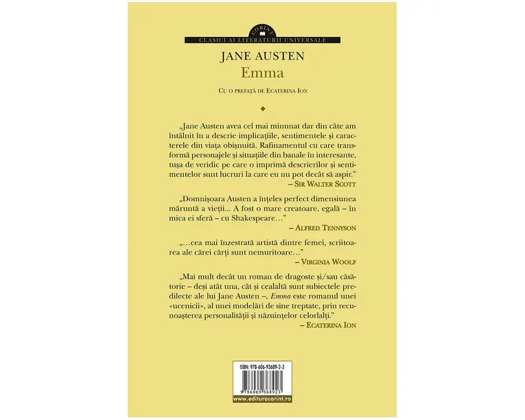 „Jane Austen avea cel mai minunat dar din câte am întâlnit în a descrie implicaţiile, sentimentele şi caracterele din viaţa obişnuita. Rafinamentul cu care transforma personajele şi situaţiile din banale în interesante, tuşa de veridic pe care o imprima descrierilor şi sentimentelor sunt lucruri la care eu nu pot decât sa aspir.” – SIR WALTER SCOTT „Domnişoara Austen a înţeles perfect dimensiunea marunta a vieţii... A fost o mare creatoare, egala – în mica ei sfera – cu Shakespeare…” – ALFRED TENNYSON „…cea mai înzestrata artista dintre femei, scriitoarea ale carei carţi sunt nemuritoare…” – VIRGINIA WOOLF „Mai mult decât un roman de dragoste şi/sau casatorie – deşi atât una, cât şi cealalta sunt subiectele predilecte ale lui Jane Austen –, Emma este romanul unei «ucenicii», al unei modelari de sine treptate, prin recunoaşterea personalitaţii şi nazuinţelor celorlalţi.” – ECATERINA ION Produsul cu denumirea Emma face parte din brandul Corint, se afla in categoria Carti de sanatate si subcategoria