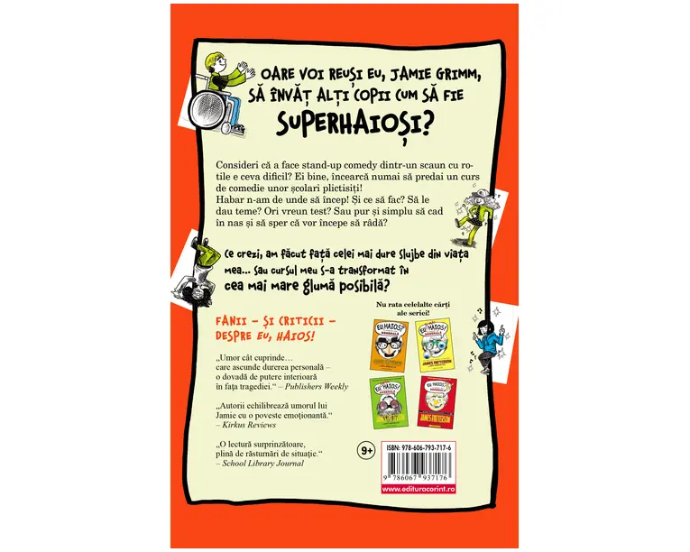 OARE VOI REUSI EU, JAMIE GRIMM, SA ÎNVAT ALTI COPII CUM SA FIE SUPERHAIOSI? Consideri ca a face stand-up comedy dintr-un scaun cu rotile e ceva dificil? Ei bine, încearca numai sa predai un curs de comedie unor scolari plictisiti! Habar n-am de unde sa încep! Si ce sa fac? Sa le dau teme? Ori vreun test? Sau pur si simplu sa cad în nas si sa sper ca vor începe sa râda? Ce crezi, am facut fata celei mai dure slujbe din viata mea… sau cursul meu s-a transformat în cea mai mare gluma posibila? „Umor cât cuprinde… care ascunde durerea personala – o dovada de putere interioara în faţa tragediei.“ – Publishers Weekly „Autorii echilibreaza umorul lui Jamie cu o poveste emoţionanta.“ – Kirkus Reviews „O lectura surprinzatoare, plina de rasturnari de situaţie.“ – School Library Journal Produsul cu denumirea Eu, haios! Scoala de comedie face parte din brandul Corint, se afla in categoria Carti de sanatate si subcategoria