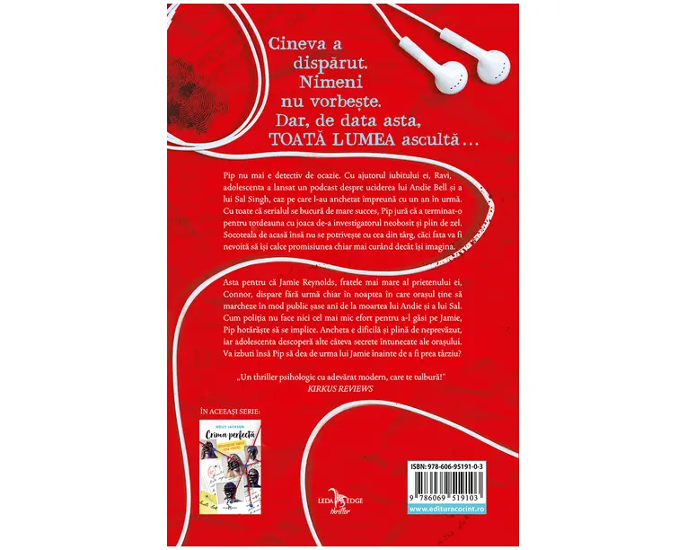 Pip nu mai e detectiv de ocazie. Cu ajutorul iubitului ei, Ravi, adolescenta a lansat un podcast despre uciderea lui Andie Bell si a lui Sal Singh, caz pe care l-au anchetat împreuna cu un an în urma. Cu toate ca serialul se bucura de mare succes, Pip jura ca a terminat-o pentru totdeauna cu joaca de-a investigatorul neobosit si plin de zel. Socoteala de acasa, însa, nu se potriveste cu cea din târg, caci fata va fi nevoita sa îsi calce promisiunea chiar mai curând decât îsi imagina. Asta, pentru ca Jamie Reynolds, fratele mai mare al prietenului ei, Connor, dispare fara urma chiar în noaptea în care orasul tine sa marcheze în mod public sase ani de la moartea lui Andie si a lui Sal. Cum politia nu face nici cel mai mic efort pentru a-l gasi pe Jamie, Pip hotaraste sa se implice. Ancheta e dificila si plina de neprevazut, iar adolescenta descopera alte câteva secrete întunecate ale orasului. Va izbuti însa Pip sa dea de urma lui Jamie înainte de a fi prea târziu? „Cu siguranta, nenumaratii admiratori ai podcasturilor despre crime care s-au petrecut în realitate se vor opri asupra acestei carti si nu vor fi deloc dezamagiti.ˮ The Bulletin „Un thriller diabolic de bine ticluit, care m-a silit sa fac supozitii, doar pentru a-mi demonstra ca m-am înselat pâna în ultima clipa.ˮ Laura Purcell, autoarea bestsellerului The Silent Companions „Întunecat, periculos si cu o intriga complicata; inima mi-a sarit din piept [...] Holly Jackson este un nume de care vom mai auzi, sunt sigura de asta!ˮ Laura Steven, autoarea romanului The Exact Opposite of Okay „Un thriller cu adevarat modern, care te tulbura!” Kirkus Reviews Produsul cu denumirea Fata cuminte, razbunare crunta (vol.2 din seria Crima perfecta) face parte din brandul Corint, se afla in categoria Carti de sanatate si subcategoria