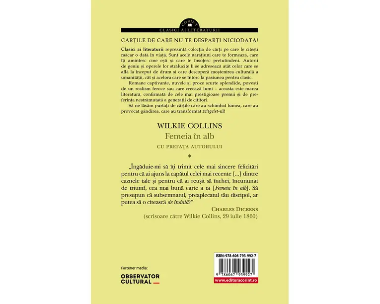 Unul dintre cele mai valoroase si mai apreciate romane mistery din literatura clasica, Femeia în alb a devenit un adevarat fenomen editorial înca de la aparitie (1860), depasind la acea vreme pâna si succesul romanelor lui Charles Dickens, bun prieten si mentor al autorului. Republicat încontinuu de mai bine de un secol si jumatate, volumul Femeia în alb este considerat primul asa-numit „roman senzational” englezesc, însa este pretuit nu doar pentru caracterul novator, ci si pentru personajele construite, pentru naratiunea complexa si palpitanta, pentru folosirea tehnicii naratorilor multipli si pentru modul în care expune situatia legala – absolut nedreapta – a femeilor casatorite din acea vreme. Acest edificiu complex care este romanul Femeia în alb, construit cu mâna de maestru, este dominat de prezenta a doua personaje considerate printre cele mai spectaculoase din toata literatura victoriana: Marian Halcombe – o femeie cu un aer întunecat, teribil de inteligenta, cu comportament considerat masculin, dar atât de fascinanta – si contele Fosco – înspaimântatorul si flamboaiantul maestru papusar, cel care orchestreaza întreaga intriga, devenit în timp prototip literar care a servit drept inspiratie si pentru alti antagonisti fictionali. Povestea – inspirata de un caz real – debuteaza cu o întâlnire surprinzatoare între profesorul de desen Walter Hartright si o femeie stranie, îmbracata în alb, care îi cere ajutorul sa scape de urmaritori si care pare dornica sa îi împartaseasca un secret tulburator. Walter este angajat de aristocratul Frederick Fairlie ca profesor particular pentru tinerele lui nepoate, surorile vitrege Laura Fairlie si Marian Halcombe. Desi Walter si Laura ajung sa se iubeasca, tânara trebuie sa respecte dorinta raposatului ei parinte, aceea de a se casatori cu baronetul sir Percival Glyde, cel care îi aduce în scena pe contele italian Fosco si pe sotia acestuia – matusa dezmostenita a celor doua surori. Cei trei tineri, Walter, Laura si Marian, sunt atrasi, fara voia lor, într-o spirala de mistere, crime, secrete din trecut, spionaj, rapiri, rasturnari de situatie si otraviri, povestea ramânând, cu toate acestea, una eminamente de dragoste – dragoste frateasca si dragoste romantica. Editia aparuta la Editura Corint sub imprintul Clasici ai literaturii – în traducerea lui Lucian Popa – beneficiaza si de o prefata constând într-un text semnat de Wilkie Collins, prin care autorul îsi explica tehnica scriitoriceasca, de un tabel cronologic si de un aparat critic bogat, menit sa puna pentru cititorul modern opera în contextul epocii. „Îngaduie-mi sa îti trimit cele mai sincere felicitari pentru ca ai ajuns la capatul celei mai recente [...] dintre caznele tale si pentru ca ai reusit sa închei, încununat de triumf, cea mai buna carte a ta [Femeia în alb]. Sa presupun ca subsemnatul, preaplecatul tau discipol, ar putea sa o citeasca de îndata?” Charles Dickens, scrisoare catre Wilkie Collins, 29 iulie 1860 „Astazi, oamenii tind sa îl cunoasca pe Wilkie Collins fie pentru Femeia în alb (1860), fie pentru Piatra Lunii (1868). As spune ca nu e o mostenire de lepadat, câta vreme primul a deschis seria asa-numitelor «romane senzationale» − un gen extraordinar de popular în perioada victoriana, un melanj între temele romanelor de groaza gotice si elementele de realism ale vietii private −, iar cel din urma este considerat «înainte-mergatorul» povestilor cu detectivi moderne. [...] Însa Collins a fost mai mult [...]. În cele mai bune lucrari ale sale, el transforma dorinta primara de a afla − de ce sau de cine fugea femeia în alb etc. − în ceva care, în mod straniu, tine de metafizica.” Jonathan Rosen, The New Yorker „Ideea care sta la baza volumului Femeia în alb este aceea a unei conspiratii în viata particulara, în care circumstantele sunt astfel manevrate, încât sa jefuiasca o femeie de propria identitate prin confundarea ei cu o alta femeie, suficient de asemanatoare cu ea ca aspect, astfel încât sa fie potrivita pentru atingerea acestui scop malefic. Distrugerea identitatii ei constituie prima parte a povestirii; iar recuperarea identitatii sale reprezinta cea de‑a doua parte.” Wilkie Collins, „Cum mi‑am scris cartile”, The Globe Produsul cu denumirea Femeia in alb face parte din brandul Corint, se afla in categoria Carti de sanatate si subcategoria