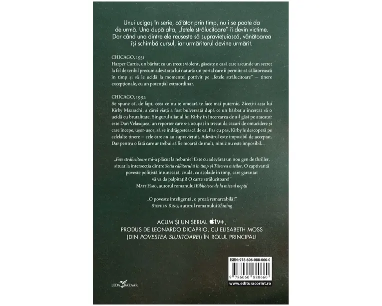 ACUM SI UN SERIAL APPLE TV+, PRODUS DE LEONARDO DICAPRIO, CU ELISABETH MOSS (DIN POVESTEA SLUJITOAREI) IN ROLUL PRINCIPAL! Unui ucigas in serie, calator prin timp, nu i se poate da de urma. Una dupa alta, „fetele stralucitoare” ii devin victime. Dar cand una dintre ele reuseste sa supravietuiasca, vanatoarea isi schimba cursul, iar urmaritorul devine urmarit. CHICAGO, 1931 Harper Curtis, un barbat cu un trecut violent, gaseste o casa care ascunde un secret la fel de teribil precum adevarata lui natura: un portal care ii permite sa calatoreasca in timp si sa le ucida la momentul potrivit pe „fetele stralucitoare” tinere exceptionale, cu un potential extraordinar. CHICAGO, 1992 Se spune ca, de fapt, ceea ce nu te omoara te face mai puternic. Ziceti-i asta lui Kirby Mazrachi, a carei viata a fost bulversata dupa ce un barbat a incercat sa o ucida cu brutalitate. Singurul aliat al lui Kirby in incercarea de a-l gasi pe atacator este Dan Velasquez, un reporter care s-a ocupat in trecut de cazuri de omucidere si care incepe, usor-usor, sa se indragosteasca de ea. Pas cu pas, Kirby le descopera pe celelalte tinere cele care nu au supravietuit. Adevarul este imposibil de acceptat. Dar pentru o fata care ar trebui sa fie moarta de mult, nimic nu este imposibil… „Fete stralucitoare mi-a placut la nebunie! Este cu adevarat un nou gen de thriller, situat la intersectia dintre Sotia calatorului in timp si Tacerea mieilor. O captivanta poveste politista intunecata, cruda, cu acolade in timp, care garantat va va da palpitatii! O carte stralucitoare!” Matt Haig, autorul romanului Biblioteca de la miezul noptii „O poveste inteligenta, o proza remarcabila!” Stephen King, autorul romanului Shining „Incitant! Beukes se ocupa de lucruri usor suprarealiste in moduri pline de realism. Sunt fascinata!” Gillian Flynn, autoarea romanului Fata disparuta „Profund originala, frumos scrisa, si trebuie sa marturisesc ca mi-a dat fiori de groaza cumpliti. O carte cu totul speciala!” Tana French, autoarea romanului Misterul ulmului „O extraordinara opera de fictiune, plina de suspans. Mai mult chiar, o fabuloasa combinatie de calatorie in timp si crime in serie, intersectarea celor doua teme invitandu-l pe cititor sa cugete la ideea de liber-arbitru, predestinare si cauzalitate intr-o atmosfera ametitoare si pasionanta.” Cory Doctorow, autorul romanului Little Brother „Un roman extrem de inteli- gent! […] Absolut cutremurator! Jocul lui Beukes intre realitate si fantezie este o opera de maestru.” William Gibson, autorul romanului Neuromantul Produsul cu denumirea Fete stralucitoare face parte din brandul Corint, se afla in categoria Carti de sanatate si subcategoria