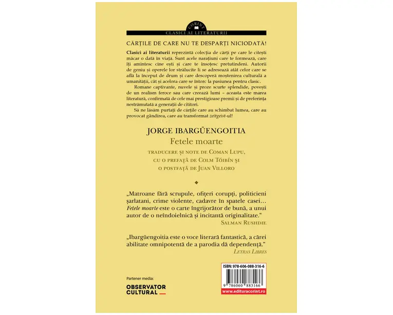 Exponent de marca al literaturii latino-americane si unul dintre cei mai apreciati autori mexicani, Jorge Ibargüengoitia dramaturg, scenarist si romancier intriga prin scriitura sa impregnata de umor negru, insa care isi trage seva din teme sociale si filozofice esentiale. Romanul Fetele moarte porneste de la asa-zisele marturii, redate „ca atare”, ale personajelor implicate; cu toate acestea, „Unele dintre evenimentele povestite aici sunt reale. Toate personajele sunt imaginare.”, ne avertizeaza dintru inceput autorul, sugerandu-le astfel cititorilor sai si cheia in care trebuie lecturata aceasta excentrica fictiune. Povestea celor doua surori patroane de bordel, care, parca fara sa constientizeze, ajung, treptat, criminale in serie, este relatata realist, de un narator aparent neimplicat. In pofida acestui procedeu narativ ce mimeaza distanta emotionala, se mai contureaza un personaj complex si intunecat: Mexicul insusi, cu contradictiile sale, cu frumusetea si coruptia lui, cu simplitatea si misterul lui, cu personajele sale inocente ori stapanite de rau. In traducerea remarcabila a profesorului hispanist Coman Lupu, cu o prefata de romancierul, poetul, dramaturgul, jurnalistul si criticul literar irlandez Colm Tóibín si o postfata de scriitorul si jurnalistul mexican Juan Villoro, romanul Fetele moarte se alatura titlurilor publicate in colectia „Clasici ai literaturii”. „Exista, la inceputul cartii, o mentiune: «Unele dintre evenimentele povestite aici sunt reale. Toate personajele sunt imaginare.» Ibargüengoitia ne cere totodata sa credem povestea si sa acceptam ca el insusi a inventat o buna parte din ea. Dar ne cere, de asemenea, si sa devenim partasi la un joc care este mult mai nuantat, un joc in care tocmai subintelesurile si subtilitatile refuza sa aiba un inteles la indemana.” COLM TÓIBÍN, „Prefata” „Matroane fara scrupule, ofiteri corupti, politicieni sarlatani, crime violente, cadavre in spatele casei… Fetele moarte este o carte ingrijorator de buna, a unui autor de o neindoielnica si incitanta originalitate.” SALMAN RUSHDIE „Ibargüengoitia este o voce literara fantastica, a carei abilitate omnipotenta de a parodia da dependenta.” LETRAS LIBRES „Ceea ce a facut Ibargüengoitia in acest roman cu respectivele «simple statistici sau rapoarte» a fost sa le ofere, in mod ingenios, cu viclenie, o «textura» aparte, astfel incat monotonia limbajului, tonul retinut si absenta profunzimii psihologice sa permita romanului sa se imbogateasca atat prin ambiguitate, cat si printr-o indignare tainica. Ibargüengoitia creeaza un spatiu fictional tulburator.” COLM TÓIBÍN, „Prefata” „Fiecare dintre romanele lui Ibargüengoitia ramane fidel devizei uneia dintre matusile sale din Guanajuato: «Viata a vrut sa fiu nefericita, dar eu n-am avut chef de asa ceva.»” JUAN VILLORO, „Postfata” Produsul cu denumirea Fetele moarte face parte din brandul Corint, se afla in categoria Carti de sanatate si subcategoria