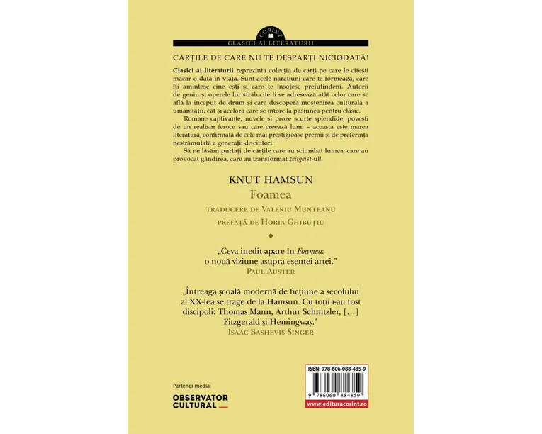 <p>Knut Hamsun, unul dintre cei mai importanti si mai controversati scriitori ai secolului al XX-lea, castigator al Premiului Nobel pentru Literatura in 1920, creeaza in <em>Foamea </em>portretul tulburator al unui tanar scriitor norvegian stramtorat, care rataceste pe strazile din Christiania. Incercand sa supravietuiasca cu putinii bani castigati pentru articolele pe care le scrie ocazional, ajunge curand sa recurga la gesturi extreme; in pragul infometarii, pierde contactul cu realitatea. Desi aluneca inspre alienare mintala, protagonistul se agata de singurul lucru care i-a mai ramas: integritatea morala. Publicat in 1890, romanul cu nuante autobiografice al lui Hamsun ramane o lucrare de referinta in literatura universala.</p> Produsul cu denumirea Foamea face parte din brandul Corint, se afla in categoria Carti de sanatate si subcategoria
