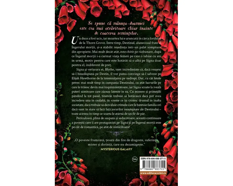 Un duce a fost ucis, iar moartea lui e aruncata in carca lordului de la Thorn Grove. Intre timp, Destinul, alunecosul frate al Ingerului mortii, si-a stabilit resedinta intr-un palat somptuos din apropiere. Mai mult decat atat, este chitit pe razbunare, dupa ce Ingerul mortii i-a curmat viata femeii pe care o iubise cu ani in urma, motiv pentru care este hotarat sa o aiba pe Signa doar pentru el, indiferent de pret. Signa si verisoara ei, Blythe, sunt incredintate ca, daca reusesc sa-l binedispuna pe Destin, il vor putea convinge sa-l salveze pe Elijah Hawthorne de la intemnitarea pe nedrept. Dar, cu cat fetele petrec mai mult timp in compania Destinului, cu atat lucrurile pe care le traiesc devin mai inspaimantatoare, iar Signa scoate la iveala puteri uimitoare care zaceau latente in ea. Cu mistere si primejdii pandind la tot pasul, tinerele trebuie sa hotarasca daca pot avea incredere una in cealalta, in vreme ce isi croiesc drumul in inalta societate, daca trebuie sa dezvaluie crimele care le bantuie familia ori daca sunt in stare sa faca fata jocurilor neasteptate ale Destinului toate acestea in timp ce soarta le atarna de un fir de par. Periculoasa, plina de suspans si seducatoare, aceasta continuare a povestii care ii are protagonisti pe Signa si pe Ingerul mortii este pe cat de romantica, pe atat de nimicitoare! „Adalyn Grace da viata conceptelor abstracte de moarte si destin, creand personaje fermecatoare, dar cu defecte, care ii vor fascina pe cititori. Rasturnarile de situatie fac ca volumul sa isi pastreze tenta politista, imbinand pericolul cu farmecul. O poveste frumoasa, tesuta din fire de dragoste, suferinta, mister si dorinta, care nu dezamageste.” Mysterious Galaxy „Singura modalitate prin care Signa isi poate salva unchiul de la a merge nevinovat la inchisoare este sa accepte avansurile pe care i le face Destinul, chiar daca acest lucru trezeste in ea puteri inspaimantatoare, pe care tanara lupta din rasputeri sa le controleze.” Publishers Weekly „Secrete, blesteme, mister, dragoste si un Inger al mortii!” Jennifer L. Armentrout Produsul cu denumirea Foxglove (al doilea volum al seriei Beladona), paperback face parte din brandul Corint, se afla in categoria Carti de sanatate si subcategoria