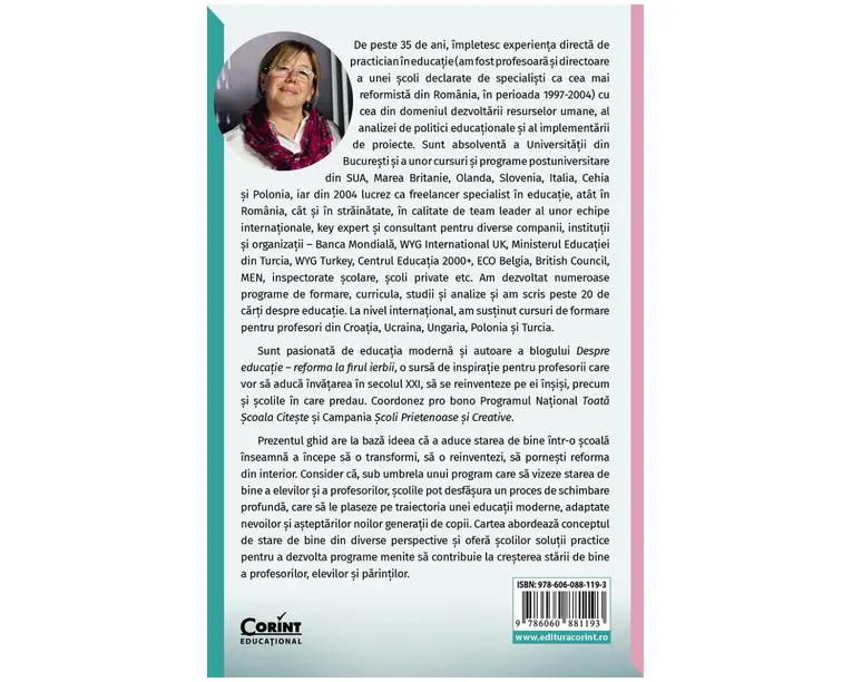 Un ghid pentru profesori, directori şi parinţi, cu solutii practice care îi vor ajuta sa aduca STAREA DE BINE în scoala lor. Prezentul ghid are la baza ideea ca a aduce starea de bine într-o scoala înseamna a începe sa o transformi, sa o reinventezi, sa pornesti reforma din interior. Autoarea considera ca, sub umbrela unui program care sa vizeze starea de bine a elevilor si a profesorilor, scolile pot desfasura un proces de schimbare profunda, care sa le plaseze pe traiectoria unei educatii moderne, adaptate nevoilor si asteptarilor noilor generatii de copii. Cartea abordeaza conceptul de stare de bine din diverse perspective si ofera scolilor solutii practice pentru a dezvolta programe menite sa contribuie la cresterea starii de bine a profesorilor, elevilor si parintilor. Produsul cu denumirea Hai cu starea de bine in scoala! face parte din brandul Corint, se afla in categoria Carti de sanatate si subcategoria