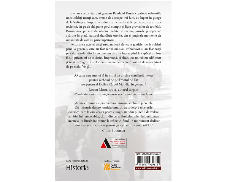 În noiembrie 1942, în urma unui distrugator contraatac executat din afara orasului, armata sovietica a pus capat asediului fortelor germane si aliate acestora si le-au încercuit, facând practic imposibila retragerea a circa 290 000 de soldati apartinând Armatei 6. Lucrarea cercetatorului german Reinhold Busch cuprinde marturiile unor soldati nemti care, vreme de aproape trei luni, au luptat în punga de la Stalingrad împotriva a doi inamici redutabili: pe de o parte armata sovietica, iar pe de alta parte vremea aspra si lipsa proviziilor de tot felul. Bizuindu-se pe sute de relatari inedite, interviuri, jurnale si reportaje aparute în presa, autorul dezvaluie, în 39 de „tablouri”, ororile, dar si putinele momente de umanitate de care au parte luptatorii în apocaliptica înclestare desfasurata pe strazile si în împrejurimile orasului. Personajele acestei carti sunt militari de toate gradele, de la soldati pâna la generali, care au fost raniti ori s-au îmbolnavit si au fost scosi pe calea aerului din încercuire sau care au luptat pâna la capat si au fost facuti prizonieri de sovietici. Împreuna, ei realizeaza o descriere edificatoare si tragica a îngrozitoarelor evenimente petrecute în orasul de trista faima de pe malul Volgai. Povestea mai putin cunoscuta a spitalelor de campanie si a punctelor de prim ajutor contribuie la întregirea imaginii cu privire la soarta cruda de care au avut parte soldatii Armatei 6, amenintati cu moartea din cauza mizeriei, frigului insuportabil, foamei, ranilor si a apropierii neînduratoarei armate sovietice. „O carte care merita sa fie citita de oricine manifesta interes pentru razboiul de pe Frontul de Est sau pentru al Doilea Razboi Mondial în general.” (Roger Moorhouse, autorul cartilor Alianta diavolilor si Comploturile pentru asasinarea lui Hitler) „Arunca lumina asupra conditiei umane, cu bune si cu rele. Da marturie despre josnicia omului, ca si despre nivelurile extraordinare la care acesta poate ajunge, atât din punctul de vedere al tariei lui remarcabile, cât si din cel al limitelor sale. Tulburatoarea lucrare a lui Busch îndeamna la reflectie, fiind un monument dedicat celor care s-au sacrificat pentru tara si pentru camarazii lor.” (Chris Buckham) Produsul cu denumirea In infernul de la Stalingrad face parte din brandul Corint, se afla in categoria Carti de sanatate si subcategoria