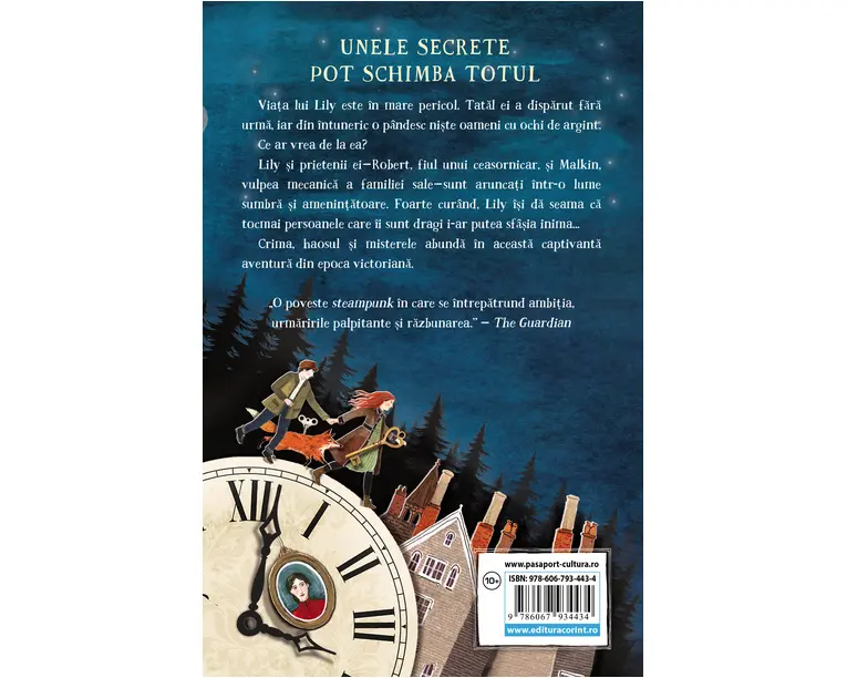 Viata lui Lily este în mare pericol. Tatal ei a disparut fara urma, iar din întuneric o pândesc niste oameni cu ochi de argint. Ce ar vrea de la ea? Lily si prietenii ei—Robert, fiul unui ceasornicar, si Malkin, vulpea mecanica a familiei sale—sunt aruncati într-o lume sumbra si amenintatoare. Foarte curând, Lily îsi da seama ca tocmai persoanele care îi sunt dragi i-ar putea sfâsia inima...Crima, haosul si misterele abunda în aceasta captivanta aventura din epoca victoriana. Inima cu cheita, sau Cogheart, titlul editiei originale în limba engleza, care este primul volum al unei trilogii care se bucura de un remarcabil succes peste tot în lume, s-a aflat pe lista scurta a numeroase premii literare, câstigând, între altele, Awesome Book Award 2018. „O poveste steampunk în care se întrepatrund ambitia, urmaririle palpitante si razbunarea.” — The Guardian Produsul cu denumirea Inima cu cheita (vol.1 din seria Cogheart) face parte din brandul Corint, se afla in categoria Carti de sanatate si subcategoria