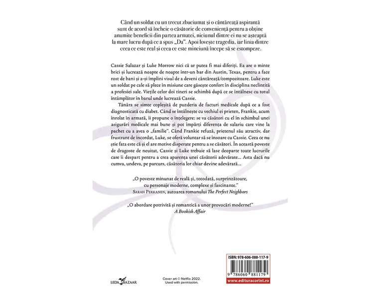 Cand un soldat cu un trecut zbuciumat si o cantareata aspiranta sunt de acord sa incheie o casatorie de convenienta pentru a obtine anumite beneficii din partea armatei, niciunul dintre ei nu se asteapta la mare lucru dupa ce a spus „Da”. Apoi loveste tragedia, iar linia dintre ceea ce este real si ceea ce este minciuna incepe sa se estompeze. Cassie Salazar si Luke Morrow nici ca ar putea fi mai diferiti. Ea are o minte brici si lucreaza noapte de noapte intr-un bar din Austin, Texas, pentru a face rost de bani si a-si implini visul de a deveni cantareata/compozitoare. Luke este un soldat pe cale sa plece in misiune care gaseste confort in disciplina neclintita a profesiei sale. Vietile celor doi tineri se schimba dupa ce se intalnesc cu totul intamplator in barul unde lucreaza Cassie. Tanara se simte coplesita de puzderia de facturi medicale dupa ce a fost diagnosticata cu diabet. Cand se intalneste cu vechiul ei prieten, Frankie, acum inrolat in armata, ii propune o intelegere: se va casatori cu el in schimbul unei asigurari medicale mai bune si pot imparti diferenta de salariu care vine la pachet cu a avea o „familie”. Cand Frankie refuza, prietenul sau atractiv, dar frustrant de incordat, Luke, se ofera voluntar sa se insoare cu Cassie. Ceea ce nu stie fata este ca si el are motive disperate pentru a se casatori. In aceasta poveste de dragoste de neuitat, Cassie si Luke trebuie sa lase deoparte toate lucrurile care ii despart pentru a crea aparenta unei casatorii adevarate… Asta daca nu cumva, undeva, pe parcurs, casatoria lor chiar devine adevarata… „O poveste minunat de reala si, totodata, surprinzatoare, cu personaje moderne, complexe si fascinante.” SARAH PEKKANEN, autoarea romanului The Perfect Neighbors „O abordare potrivita si romantica a unor provocari moderne!” A Bookish Affair „Cand am ras in hohote datorita scriiturii inteligente a lui Tess Wakefield, undeva la pagina a treia, am stiut ca Inimi Purpurii este o carte pe care o sa o ador. Autoarea a imaginat personaje complexe si pline de compasiune care se confrunta cu probleme mult prea reale si a creat o poveste de dragoste unica si tulburatoare despre doua persoane atat de profund umane, incat aproape ca ai jura ca le cunosti.” BETHANY CHASE, autoarea romanului The One That Got Away „Daca sunteti in cautarea unei carti care sa va atinga coarda sensibila, dar si a unei povesti de dragoste putin probabile, care sa va umple de entuziasm, cititi Inimi Purpurii! Este lectura perfecta pentru o zi lenesa de vara sau una relaxanta la plaja.” Confessions of a Book Addict „Inimi Purpurii este pe cat de reala, pe atat de tangibila. Autoarea propune o poveste pe care nu o mai poti lasa din mana, dar cu cat vei avansa cu lectura, cu atat vei fi mai coplesit(a) de tulburare. Singura mea obiectie este ca imi doream mai mult. Mai mult despre Cassie, mai mult despre Luke. Mai mult despre vietile lor impletite. Este o pasiune mocnita, un foc care vuieste, o scanteie, o rafala de vant care ameninta sa te spulbere.” G Reads Produsul cu denumirea Inimi Purpurii face parte din brandul Corint, se afla in categoria Leda bazaar si subcategoria