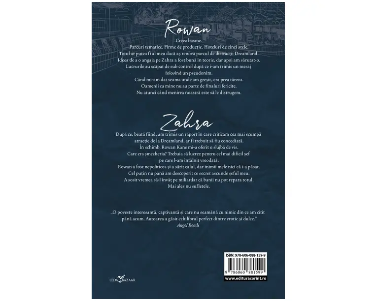 Rowan Creez basme. Parcuri tematice. Firme de productie. Hoteluri de cinci stele. Totul ar putea fi al meu daca as renova parcul de distractii Dreamland. Ideea de a o angaja pe Zahra a fost buna in teorie, dar apoi am sarutat-o. Lucrurile au scapat de sub control dupa ce i-am trimis un mesaj folosind un pseudonim. Cand mi-am dat seama unde am gresit, era prea tarziu. Oamenii ca mine nu au parte de finaluri fericite. Nu atunci cand menirea noastra este sa le distrugem. Zahra Dupa ce, beata fiind, am trimis un raport in care criticam cea mai scumpa atractie de la Dreamland, ar fi trebuit sa fiu concediata. In schimb, Rowan Kane mi-a oferit o slujba de vis. Care era smecheria? Trebuia sa lucrez pentru cel mai dificil sef pe care l-am intalnit vreodata. Rowan a fost nepoliticos si a sarit calul, dar inimii mele nici ca i-a pasat. Cel putin nu pana am descoperit ce secret ascunde seful meu. A sosit vremea sa-l invat pe miliardar ca banii nu pot repara totul. Mai ales nu sufletele. „O poveste interesanta, captivanta si care nu seamana cu nimic din ce am citit pana acum. Autoarea a gasit echilibrul perfect dintre erotic si dulce.” Angel Reads „O poveste de dragoste pentru adulti, asezonata cu scene sexy/picante, asa ca bucurati-va de ea dupa pofta inimii!” Denia Books & Baubles „Umor, momente care te vor da pe spate, personaje uimitoare, scene fierbinti si un stil care te face sa nu mai lasi cartea din mana. […] Mi-a placut foarte mult romanul Intentii ascunse si abia astept urmatoarele doua volume dedicate fratilor lui Rowan! Lauren Asher este cu siguranta o autoare pe care trebuie sa o urmarim!” The Book Dutchesses Produsul cu denumirea Intentii ascunse (vol.1 din Miliardarii de la Dreamland) face parte din brandul Corint, se afla in categoria Carti de sanatate si subcategoria