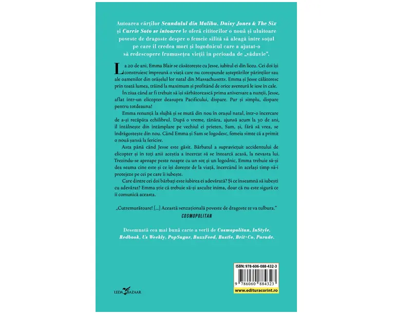 La 20 de ani, Emma Blair se casatoreste cu Jesse, iubitul ei din liceu. Cei doi isi construiesc impreuna o viata care nu corespunde asteptarilor parintilor sau ale oamenilor din oraselul lor natal din Massachusetts. Emma si Jesse calatoresc prin toata lumea, traind la maximum si profitand de orice aventura le iese in cale. In ziua cand ar fi trebuit sa isi sarbatoreasca prima aniversare a nuntii, Jesse, aflat intr-un elicopter deasupra Pacificului, dispare. Pur si simplu, dispare pentru totdeauna! Emma renunta la slujba si se muta din nou in orasul natal, intr-o incercare de a-si recapata echilibrul. Dupa o vreme, tanara, ajunsa acum la 30 de ani, il intalneste din intamplare pe vechiul ei prieten, Sam, si, fara sa vrea, se indragosteste din nou. Cand Emma si Sam se logodesc, femeia simte ca a primit o noua sansa la fericire. Asta pana cand Jesse este gasit. Barbatul a supravietuit accidentului de elicopter si in toti anii acestia a incercat sa se intoarca acasa, la nevasta lui. Trezindu-se aproape peste noapte cu un sot si un logodnic, Emma trebuie sa-si dea seama cine este si ce isi doreste de la viata, incercand in acelasi timp sa-i protejeze pe cei pe care ii iubeste. Care dintre cei doi barbati este iubirea ei adevarata? Si ce inseamna sa iubesti cu adevarat? Emma stie ca trebuie sa-si asculte inima, doar ca nu este sigura ce ii comunica aceasta. „Cutremuratoare! […] Aceasta senzationala poveste de dragoste te va tulbura.” COSMOPOLITAN „Nimeni nu scrie mai bine decat Taylor Jenkins Reid despre viata si iubire!” INSTYLE „Sfasietoarea poveste imaginata de Reid se invarte in jurul intrebarii daca este posibil sa ai mai multe suflete-pereche.” US WEEKLY „O abordare unica a unui subiect extrem de delicat.” SAM STILL READING „Pe masura ce dai pagina dupa pagina, personajele te cuceresc si te fac sa te atasezi de ele. Ajungi sa fii parte din povestile lor, din vietile lor si, uau!, dintr-odata iti dai seama ca acestea au ajuns sa isi faca un locsor permanent in inima ta.” BOOK GEEKS Produsul cu denumirea Intre doua iubiri face parte din brandul Corint, se afla in categoria Carti de sanatate si subcategoria