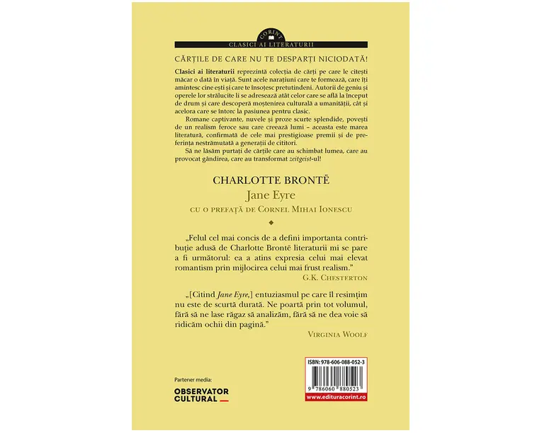 Jane Eyre, publicat în1847 de Charlotte Brontë sub pseudonimul Currer Bell, reprezinta unul dintre cele mai apreciate, mai citite si mai importante romane de dragoste din literatura universala. A revolutionat scrierea în proza atât prin conturarea personajului principal feminin atipic, redat în naratiunea la persoana I, cât si prin temele abordate: feminismul, singuratatea si iubirea, saracia si diferentele de clasa, spiritualitatea si religia, sexualitatea si datoria morala, importanta independentei femeilor – toate prezentate prin filtrul gotic caracteristic literaturii victoriene. Viata lui Jane Eyre – din copilarie pâna la vârsta maturizarii – îi este înfatisata cititorului drept o autobiografie (asa cum se si subintitula romanul): anii chinuiti, de orfana, petrecuti de protagonista alaturi de matusa si de verii ei la resedinta lor, Gateshead Hall; plecarea la pensionul Lowood, unde va cunoaste prietenia adevarata; slujba de guvernanta la conacul Thornfield, unde se îndragosteste de misteriosul domn Edward Fairfax Rochester si unde are parte de câteva evenimente inexplicabile; timpul petrecut la Moor House, unde descopera lucruri neprevazute despre familia ei si despre ea însasi, dar are parte si de perspectiva unei noi iubiri; pentru ca, în final, tânara Jane sa îsi împlineasca destinul. În imprintul Clasici ai literaturii, cititorul român va descoperi romanul într-o traducere semnata de Mirella Acsente, cu o prefata de Cornel Mihai Ionescu. „Felul cel mai concis de a defini importanta contribuie adusa de Charlotte Brontë literaturii mi se pare a fi urmatorul: ea a atins expresia celui mai elevat romantism prin mijlocirea celui mai frust realism.” G.K. Chesterton „[Citind Jane Eyre,] entuziasmul pe care îl resimtim nu este de scurta durata. Ne poarta prin tot volumul, fara sa ne lase ragaz sa analizam, fara sa ne dea voie sa ridicam ochii din pagina.” Virginia Woolf Produsul cu denumirea Jane Eyre face parte din brandul Corint, se afla in categoria Carti de sanatate si subcategoria
