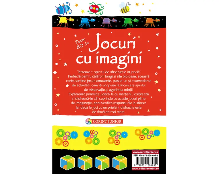 Editura Corint Junior va propune pentru perioada de vacanta, o carte cu care îti poti petrece timpul liber alaturi de copilul tau, punându-va amândoi mintea la contributie cu o serie de Jocuri cu imagini. Cartea se adreseaza copiilor peste 9 ani si face parte din categoria nonfictiune, Jocuri si activitati. Testeaza-ti spiritul de observatie în joaca! Perfecta pentru calatorii lungi si zile ploioase, aceasta carte contine jocuri amuzante, puzzle-uri si o sumedenie de activitati, care îti vor pune la încercare spiritul de observatie si agerimea mintii. Exploreaza piramide, joaca-te cu martienii, coloreaza si distreaza-te cât cuprinde cu aceste jocuri pline de imaginatie, apoi verifica raspunsurile la sfârsit. Iar daca te joci cu un prieten, distractia este de doua ori mai mare. Produsul cu denumirea Jocuri cu imagini face parte din brandul Corint, se afla in categoria Carti de sanatate si subcategoria