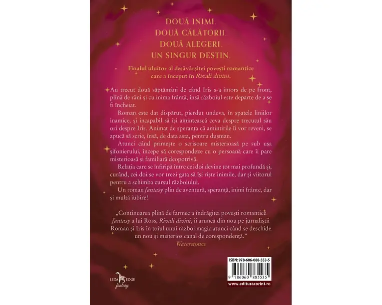 <p>Au trecut doua saptamani de cand Iris s-a intors de pe front, plina de rani si cu inima franta, insa razboiul este departe de a se fi incheiat.</p> <p> </p> <p>Roman este dat disparut, pierdut undeva, in spatele liniilor inamice, si incapabil sa isi aminteasca ceva despre trecutul sau ori despre Iris. Animat de speranta ca amintirile ii vor reveni, se apuca sa scrie, insa, de data asta, pentru dusman.</p> <p> </p> <p>Atunci cand primeste o scrisoare misterioasa pe sub usa sifonierului, incepe sa corespondeze cu o persoana care ii pare misterioasa si familiara deopotriva.</p> <p> </p> <p>Relatia care se infiripa intre cei doi devine tot mai profunda si, curand, cei doi se vor trezi gata sa isi riste inimile, dar si viitorul pentru a schimba cursul razboiului.</p> <p> </p> <p>Un roman <em>fantasy </em>plin de aventura, speranta, inimi frante, dar si multa iubire!</p> <p> </p> <p>„Continuarea plina de farmec a indragitei povesti romantice <em>fantasy </em>a lui Ross, <em>Rivali divini</em>, ii arunca din nou pe jurnalistii Roman si Iris in toiul unui razboi magic atunci cand se deschide un nou si misterios canal de corespondenta.” <em>Waterstones</em></p> <p><em> </em></p> <p>„Proaspat iesit din tipar si continuand povestea din <em>Rivali divini</em>, cel mai nou roman al Rebeccai Ross,</p> <p><em>Juraminte nemiloase</em>, aduce in fata cititorilor elemente</p> <p><em>fantasy</em>, dar si tema tradarii. Autoarea combina magia,</p> <p>dragostea si razboiul, creand rasturnari de situatie neprevazute. […] Rebecca Ross isi leaga povestea frumos, pornind de la finalul pe muchie de cutit al volumului precedent.” <em>The Highlander News</em></p> <p> </p> <p>„Am fost alaturi de personaje tot timpul si mi-am dorit</p> <p>din inima sa nu li se intample nimic rau, dar, Doamne,</p> <p>prin ce situatii incredibil de dificile le-a fost dat sa treaca! Cartea asta m-a tinut cu sufletul la gura!” <em>World of Bai</em></p> Produsul cu denumirea Juraminte nemiloase (al doilea volum al seriei „Rivali divini”) face parte din brandul Corint, se afla in categoria Carti de sanatate si subcategoria
