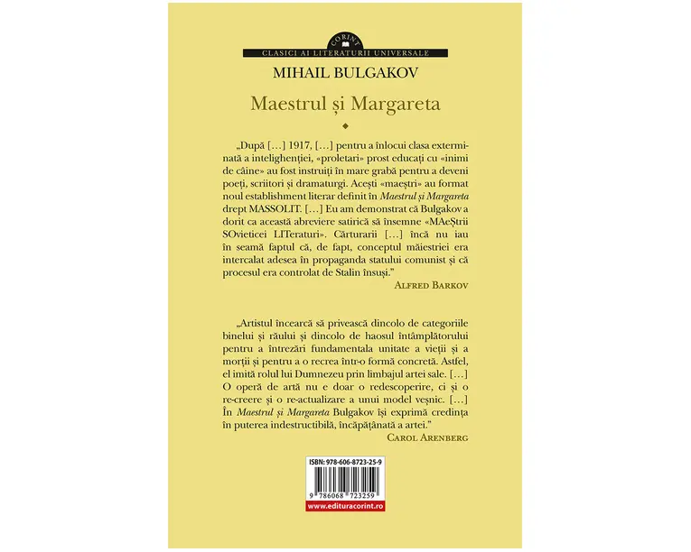 „Dupa […] 1917, […] pentru a înlocui clasa exterminata a intelighentiei, «proletari» prost educati cu «inimi de câine» au fost instruiti în mare graba pentru a deveni poeti, scriitori si dramaturgi. Acesti «maestri» au format noul establishment literar definit în Maestrul si Margareta drept MASSOLIT. […] Eu am demonstrat ca Bulgakov a dorit ca aceasta abreviere satirica sa însemne «MAestrii SOvieticei LITeraturi». Carturarii […] înca nu iau în seama faptul ca acest concept al maiestriei era intercalat adesea în propaganda statului comunist si ca procesul era controlat de Stalin însusi.” Alfred Barkov „Artistul încearca sa priveasca dincolo de categoriile binelui si raului si dincolo de haosul întâmplatorului pentru a întrezari fundamentala unitate a vietii si a mortii si pentru a o recrea într-o forma concreta. Astfel, el imita rolul lui Dumnezeu prin limbajul artei sale. […] O opera de arta nu e doar o redescoperire, ci si o re-creere si o re-actualizarea a unui model vesnic. […] În Maestrul si Margareta Bulgakov îsi exprima credinta în puterea indestructibila, încapatânata a artei.” Carol Arenberg Produsul cu denumirea Maestrul şi Margareta face parte din brandul Corint, se afla in categoria Carti de sanatate si subcategoria