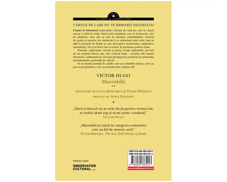 Cu o vasta intindere temporala si spatiala, romanul Mizerabilii ne ofera o adevarata cartografiere a societatii franceze de la inceputul secolului al XIX-lea, pe scena careia evolueaza numeroase personaje complexe, cu trasaturi puternice, care ilustreaza credintele si idealurile autorului insusi posibilitatea de mantuire a naturii umane, dragostea ideala, justitia sociala, demnitatea umana. Avand cinci parti, romanul prezinta parcursul personajului principal, Jean Valjean, si a catorva personaje din jurul acestuia: Fantine, Cosette, Marius, Javert, sotii Thénardier si copiii lor (Éponine, Azelma, Gavroche), de-a lungul a aproximativ trei decenii. Trimis pentru cinci ani la ocna pentru ca a furat o paine, Jean Valjean ramane de fapt inchis nouasprezece ani, din cauza incercarilor constante de a evada; odata eliberat, va fi urmarit pentru tot restul vietii de Javert, inspectorul de politie. Profund miscat de bunatatea monseniorului Bienvenu, care il iarta pe Jean Valjean pentru incercarea de a-i fura din casa si care il scapa din mainile politiei, fostul condamnat are sa isi duca mai departe viata ghidat de un singur gand: sa faca bine celorlati. Ajunge primar al orasului Montreuil‑sur‑Mer, care prospera nebanuit sub indrumarea sa, iar mai tarziu, isi dedica tot timpul si resursele ingrijirii micutei orfane Cosette, copila parasita a lui Fantine. Filonul romantic al monumentalei opere a lui Victor Hugo se impleteste cu pasaje descriptive ale Bataliei de la Waterloo din 1815 si ale Insurectiei republicane din 1832, dar si cu o riguroasa analiza a arhitecturii Parisului si a canalelor acestuia, precum si cu o serie de insemnari ample despre natura umana, societate, istorie, arhitectura, literatura. Musicalul Mizerabilii, care a avut debutul pe scena londoneza in 1985 si care se joaca si astazi, a fost rasplatit cu peste 100 de premii internationale si a fost vazut de zeci de milioane de spectatori, ramanand cel mai longeviv spectacol de musical de pe West End. Adaptare cinematografica: Les Misérables (musical), cea mai cunoscuta versiune, din 2012, cu Hugh Jackman (in rolul lui Jean Valjean), Anne Hathaway (ca Fantine) si Russell Crowe (Javert) Les Misérables (adaptarea britanica din 1978) Les Misérables (film american din 1998) Les Misérables (serial francez din 2000) Les Misérables (serial britanic din 2018) „In acest roman nu exista digresiuni. Totul este relevant pentru ca subiectul cartii este, literalmente, totul. […] Mizerabilii este un joc cu destinul: pune in scena discrepanta dintre imperfectiunile judecatii omenesti si arhetipurile perfecte ale infinitului.” Adam Thirlwell, in The Guardian „Daca scriitorul nu ar scrie decat pentru vremea lui, ar trebui sa-mi rup si sa-mi arunc condeiul.” Victor Hugo „Mizerabilii nu intra in categoria romanelor, este un fel de monstre sacré.” Peter Brooks, in The New York Review of Books „Mizerabilii ne vorbeste si astazi prin temele sale sociale, care continua sa «bantuie» vremurile de criza pe care le traversam: saracia, sansele sociale si cinismul societatii, conditia femeii, exploatarea copiilor, teme pe care Hugo reuseste sa le transpuna in personaje vii si situatii de-a dreptul picaresti, pe urmele romanului de aventuri à la Eugène Sue.” Adina Dinitoiu, in „Prefata” Produsul cu denumirea Mizerabilii face parte din brandul Corint, se afla in categoria Carti de sanatate si subcategoria