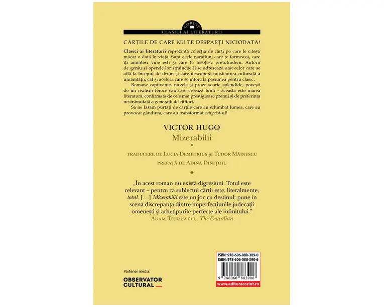 Cu o vasta intindere temporala si spatiala, romanul Mizerabilii ne ofera o adevarata cartografiere a societatii franceze de la inceputul secolului al XIX-lea, pe scena careia evolueaza numeroase personaje complexe, cu trasaturi puternice, care ilustreaza credintele si idealurile autorului insusi posibilitatea de mantuire a naturii umane, dragostea ideala, justitia sociala, demnitatea umana. Avand cinci parti, romanul prezinta parcursul personajului principal, Jean Valjean, si a catorva personaje din jurul acestuia: Fantine, Cosette, Marius, Javert, sotii Thénardier si copiii lor (Éponine, Azelma, Gavroche), de-a lungul a aproximativ trei decenii. Trimis pentru cinci ani la ocna pentru ca a furat o paine, Jean Valjean ramane de fapt inchis nouasprezece ani, din cauza incercarilor constante de a evada; odata eliberat, va fi urmarit pentru tot restul vietii de Javert, inspectorul de politie. Profund miscat de bunatatea monseniorului Bienvenu, care il iarta pe Jean Valjean pentru incercarea de a-i fura din casa si care il scapa din mainile politiei, fostul condamnat are sa isi duca mai departe viata ghidat de un singur gand: sa faca bine celorlati. Ajunge primar al orasului Montreuil‑sur‑Mer, care prospera nebanuit sub indrumarea sa, iar mai tarziu, isi dedica tot timpul si resursele ingrijirii micutei orfane Cosette, copila parasita a lui Fantine. Filonul romantic al monumentalei opere a lui Victor Hugo se impleteste cu pasaje descriptive ale Bataliei de la Waterloo din 1815 si ale Insurectiei republicane din 1832, dar si cu o riguroasa analiza a arhitecturii Parisului si a canalelor acestuia, precum si cu o serie de insemnari ample despre natura umana, societate, istorie, arhitectura, literatura. Musicalul Mizerabilii, care a avut debutul pe scena londoneza in 1985 si care se joaca si astazi, a fost rasplatit cu peste 100 de premii internationale si a fost vazut de zeci de milioane de spectatori, ramanand cel mai longeviv spectacol de musical de pe West End. Adaptare cinematografica: Les Misérables (musical), cea mai cunoscuta versiune, din 2012, cu Hugh Jackman (in rolul lui Jean Valjean), Anne Hathaway (ca Fantine) si Russell Crowe (Javert) Les Misérables (adaptarea britanica din 1978) Les Misérables (film american din 1998) Les Misérables (serial francez din 2000) Les Misérables (serial britanic din 2018) „In acest roman nu exista digresiuni. Totul este relevant pentru ca subiectul cartii este, literalmente, totul. […] Mizerabilii este un joc cu destinul: pune in scena discrepanta dintre imperfectiunile judecatii omenesti si arhetipurile perfecte ale infinitului.” Adam Thirlwell, in The Guardian „Daca scriitorul nu ar scrie decat pentru vremea lui, ar trebui sa-mi rup si sa-mi arunc condeiul.” Victor Hugo „Mizerabilii nu intra in categoria romanelor, este un fel de monstre sacré.” Peter Brooks, in The New York Review of Books „Mizerabilii ne vorbeste si astazi prin temele sale sociale, care continua sa «bantuie» vremurile de criza pe care le traversam: saracia, sansele sociale si cinismul societatii, conditia femeii, exploatarea copiilor, teme pe care Hugo reuseste sa le transpuna in personaje vii si situatii de-a dreptul picaresti, pe urmele romanului de aventuri à la Eugène Sue.” Adina Dinitoiu, in „Prefata” Produsul cu denumirea Mizerabilii face parte din brandul Corint, se afla in categoria Carti de sanatate si subcategoria