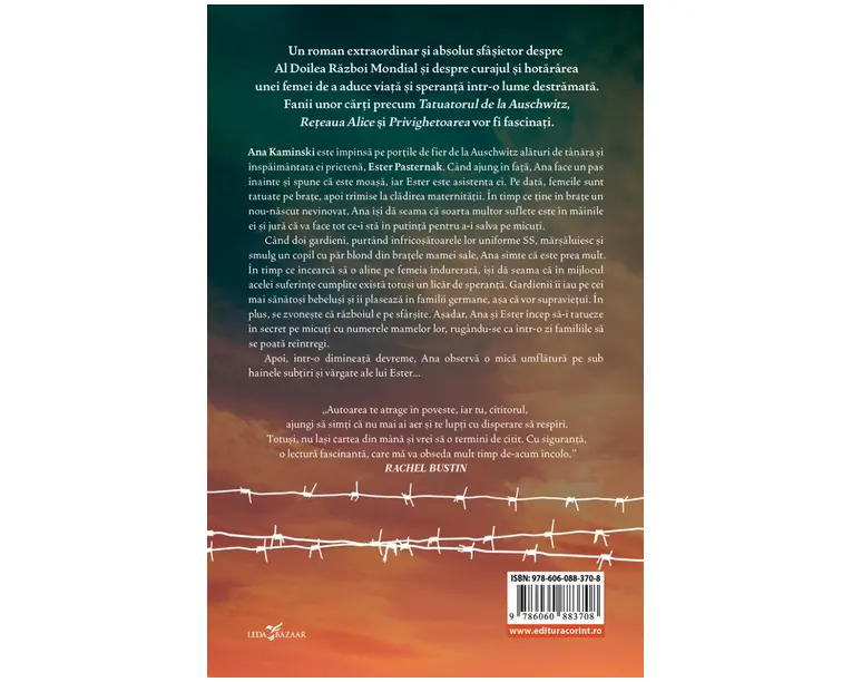 Ana Kaminski este impinsa pe portile de fier de la Auschwitz alaturi de tanara si inspaimantata ei prietena, Ester Pasternak. Cand ajung in fata, Ana face un pas inainte si spune ca este moasa, iar Ester este asistenta ei. Pe data, femeile sunt tatuate pe brate, apoi trimise la cladirea maternitatii. In timp ce tine in brate un nou-nascut nevinovat, Ana isi da seama ca soarta multor suflete este in mainile ei si jura ca va face tot ce-i sta in putinta pentru a-i salva pe micuti. Cand doi gardieni, purtand infricosatoarele lor uniforme SS, marsaluiesc si smulg un copil cu par blond din bratele mamei sale, Ana simte ca este prea mult. In timp ce incearca sa o aline pe femeia indurerata, isi da seama ca in mijlocul acelei suferinte cumplite exista totusi un licar de speranta. Gardienii ii iau pe cei mai sanatosi bebelusi si ii plaseaza in familii germane, asa ca vor supravietui. In plus, se zvoneste ca razboiul e pe sfarsite. Asadar, Ana si Ester incep sa-i tatueze in secret pe micuti cu numerele mamelor lor, rugandu-se ca intr-o zi familiile sa se poata reintregi. Apoi, intr-o dimineata devreme, Ana observa o mica umflatura pe sub hainele subtiri si vargate ale lui Ester… „Autoarea te atrage in poveste, iar tu, cititorul, ajungi sa simti ca nu mai ai aer si te lupti cu disperare sa respiri. Totusi, nu lasi cartea din mana si vrei sa o termini de citit. Cu siguranta, o lectura fascinanta, care ma va obseda mult timp de-acum incolo.” Rachel Bustin „Sfasietoare, tulburatoare, obsedanta, dar si plina de speranta, Moasa de la Auschwitz vorbeste despre dragoste, putere si curaj.” Emma’s Biblio Treasures „Romanul Moasa de la Auschwitz iti va frange inima, dar sufletul iti va fi cuprins de admiratie si dragoste cand iti vei da seama ca iubirea se raspandeste chiar si in cel mai adanc hau. O poveste puternica, plasata intr-o vreme a raului absolut.” Christian Bookaholic Produsul cu denumirea Moasa de la Auschwitz face parte din brandul Corint, se afla in categoria Carti de sanatate si subcategoria
