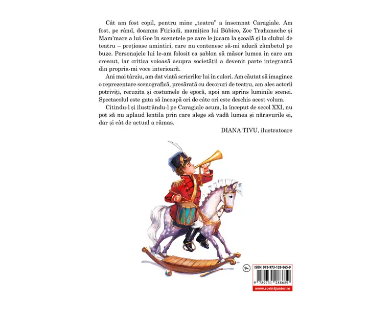 Momentele si schitele lui Caragiale, care au încântat si au educat nenumarate generatii – de copii, dar si de adulti –, se bucura acum de noi si inspirate ilustratii. Umorul, ironia fina în fata moravurilor societatii, comicul si naratiunea savuroase ale lui Caragiale se îmbina cu ilustratiile fermecatoare ale Dianei Tivu, aducând în fata cititorilor un univers familiar si îndragit, care reuseste, în mod remarcabil, sa surprinda si sa captiveze din nou publicul. Cuvânt din partea ilustratoarei: „Cât am fost copil, pentru mine «teatru» a însemnat Caragiale. Am fost, pe rând, doamna Ftiriadi, mamitica lui Bùbico, Zoe Trahanache si Mam’mare a lui Goe în scenetele pe care le jucam la scoala si la clubul de teatru – pretioase amintiri, care nu contenesc sa-mi aduca zâmbetul pe buze. Personajele lui le-am folosit ca sablon sa masor lumea în care am crescut, iar critica voioasa asupra societatii a devenit parte din propria-mi voce interioara. Ani mai târziu, am dat viata scrierilor lui în culori. Am cautat sa imaginez o reprezentare scenografica, cu decoruri de teatru, am ales actorii potriviti, recuzita si costumele de epoca, apoi am aprins luminile scenei. Spectacolul este gata sa înceapa ori de câte ori este deschis acest volum. Citindu-l si ilustrându-l pe Caragiale acum, la început de secol XXI, nu pot sa nu aplaud lentila prin care alege sa vada lumea si naravurile ei, dar si cât de actual a ramas.” Diana Tivu, ilustratoare „Nimeni înaintea lui, numai Creanga în acelasi timp cu el, destui de putini dupa dânsii au fost scriitori care au adus în notarea graiului viu aceeasi preciziune a auzului, aceeasi intuitie exacta a sintaxei vorbite, a vocabularului si a inflexiunilor care ne uimesc în proza lui Caragiale. Recititi oricare din paginile lui Caragiale, adevarul vorbirii este izvorul încântarii mereu reînnoite pe care o sorbim din ele. Omul nu monologheaza însa în paginile acestea. Vorbirea lui este o întrebare sau un raspuns. Oamenii lui Caragiale se gasesc totdeauna în actiune, în actiunea orala, adica în dialog.” – Tudor Vianu „Opera lui Caragiale e subestimata de catre unii sub motiv ca ea zugraveste moravurile si ca acestea sunt efemere. N‑ar mai exista bunaoara deputati agramati si comisari escroci. Cu toate acestea, exista tipuri sociologice, precum exista categorii individuale, si piesa de moravuri nu sta mai prejos decât piesa de caracter. În virtutea inegalitatii eterne între indivizi, vor fi totdeauna parveniti care sa foloseasca paiatereste formele în care au intrat de curând. Din observatiile de moravuri vin mai ales bufoneria, farsa grasa, iar studiul atitudinilor sociale vesnice s‑a concentrat în câteva formule fara gres, constituind un comic aproape pur.” – George Calinescu Produsul cu denumirea Momente si schite alese pentru copii face parte din brandul Corint, se afla in categoria Carti de sanatate si subcategoria