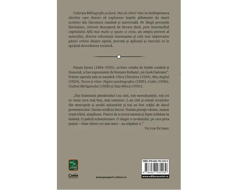 Viata lui Panait Istrati este, ea însasi, subiect de roman de aventuri; iar scriitorul este primul care o preface în literatura, întâmplarile traite fiind principala sursa de inspiratie pentru propria opera. Mos Anghel este un asemenea text, caci din cele trei parti care îl alcatuiesc, primele doua sunt create pe osatura autobiografica. Personajul al carui nume da titlul scrierii este unchiul lui Adrian Zografi, un alter ego al scriitorului. Un alt personaj masculin cu o poveste de viata impresionanta (si cu un destin apasator) este capitanul Mavromati, un grec. Bucata autobiografica are ca tema prietenia dintre un adult si un copil de numai 13 ani, ajuns ucenic în crâsma lui Kir Leonida. Pentru copilul Panait Istrati, capitanul Mavromati este (la fel ca Mos Anghel pentru Adrian) adevaratul tata, pentru ca tatal biologic nu i‑a fost aproape niciodata. Pe lânga scrierea fascinanta a lui Panait Istrati, cititorii descopera, prin intermediul capitolului Afla mai multe si spune ce crezi, un amplu portret al autorului, diverse informatii interesante si cele mai importante pareri critice despre opera, precum si aplicatii si exercitii ce le sprijina dezvoltarea creativa. Produsul cu denumirea Mos Anghel. Capitan Mavromati face parte din brandul Corint, se afla in categoria Carti de sanatate si subcategoria