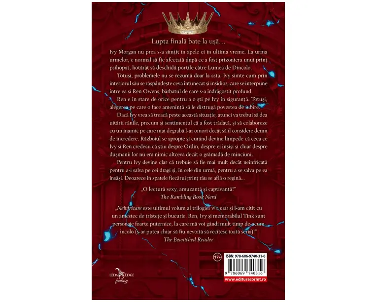 Ivy Morgan nu prea s-a simtit in apele ei in ultima vreme. La urma urmelor, e normal sa fie afectata dupa ce a fost prizoniera unui print psihopat, hotarat sa deschida portile catre Lumea de Dincolo. Totusi, problemele nu se rezuma doar la asta. Ivy simte cum prin interiorul sau se raspandeste ceva intunecat si insidios, care se interpune intre ea si Ren Owens, barbatul de care s-a indragostit profund. Ren e in stare de orice pentru a o sti pe Ivy in siguranta. Totusi, alegerea pe care o face ameninta sa le distruga povestea de iubire. Daca Ivy vrea sa treaca peste aceasta situatie, atunci va trebui sa dea uitarii ranile, precum si sentimentul ca a fost tradata, si sa colaboreze cu un inamic pe care mai degraba l-ar omori decat sa il considere demn de incredere. Razboiul se apropie si curand devine limpede ca ceea ce Ivy si Ren credeau ca stiu despre Ordin, despre ei insisi si chiar despre dusmanii lor nu era nimic altceva decat o gramada de minciuni. Pentru Ivy devine clar ca trebuie sa fie mai mult decat neinfricata pentru a-i salva pe cei dragi si, in cele din urma, pentru a se salva pe ea insasi. Deoarece in spatele fiecarui print rau se afla o regina... „O lectura sexy, amuzanta si captivanta!” The Rambling Book Nerd „Neinfricare este ultimul volum al trilogiei „Wicked” si l-am citit cu un amestec de tristete si bucurie. Ren, Ivy si memorabilul Tink sunt personaje foarte puternice, la care ma voi gandi mult timp de-acum incolo (s-ar putea chiar sa fiu nevoita sa recitesc toata seria)!” The Bewitched Reader Produsul cu denumirea Neinfricare (al treilea volum al seriei Wicked) face parte din brandul Corint, se afla in categoria Fictiune si subcategoria