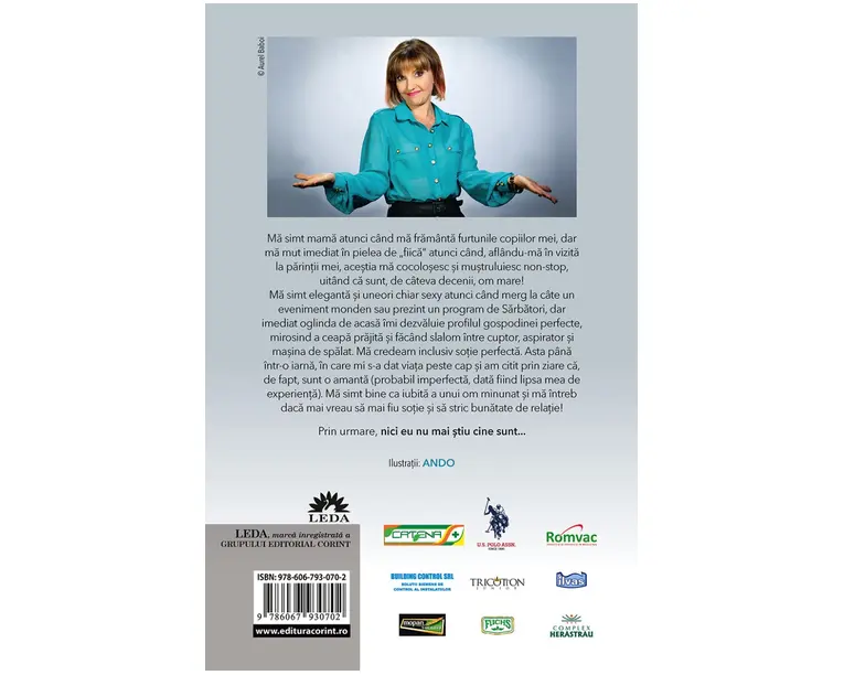 Editura Corint va invita din nou în lumea plina de dileme, semne de întrebare si raspunsuri simpatice ale realizatoarei de televiziune Marina Almasan. Va sta alaturi volumul Nici eu nu mai stiu cine sunt… „Ma simt mama atunci când ma framânta furtunile copiilor mei, dar ma mut imediat în pielea de „fiica" atunci când, aflându-ma în vizita la parintii mei, acestia ma cocolosesc si mustruluiesc non-stop, uitând ca sunt, de câteva decenii, om mare! Ma simt eleganta si uneori chiar sexy atunci când merg la câte un eveniment monden sau prezint un program de Sarbatori, dar imediat oglinda de acasa îmi dezvaluie profilul gospodinei perfecte, mirosind a ceapa prajita si facând slalom între cuptor, aspirator si masina de spalat. Ma credeam inclusiv sotie perfecta. Asta pâna într-o iarna, în care mi s-a dat viata peste cap si am citit prin ziare ca, de fapt, sunt o amanta (probabil imperfecta, data fiind lipsa mea de experienta). Ma simt bine ca iubita a unui om minunat si ma întreb daca mai vreau sa mai fiu sotie si sa stric bunatate de relatie! n Prin urmare, nici eu nu mai stiu cine sunt...” MARINA ALMASAN Produsul cu denumirea Nici eu nu mai ştiu cine sunt... face parte din brandul Corint, se afla in categoria Carti de sanatate si subcategoria
