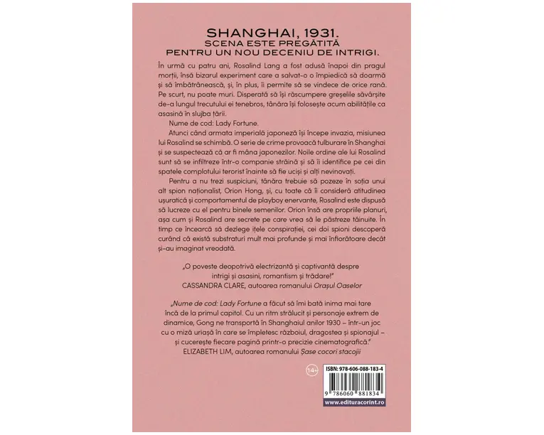 In urma cu patru ani, Rosalind Lang a fost adusa inapoi din pragul mortii, insa bizarul experiment care a salvat-o o impiedica sa doarma si sa imbatraneasca, si, in plus, ii permite sa se vindece de orice rana. Pe scurt, nu poate muri. Disperata sa isi rascumpere greselile savarsite de-a lungul trecutului ei tenebros, tanara isi foloseste acum abilitatile ca asasina in slujba tarii. Nume de cod: Lady Fortune. Atunci cand armata imperiala japoneza isi incepe invazia, misiunea lui Rosalind se schimba. O serie de crime provoaca tulburare in Shanghai si se suspecteaza ca ar fi mana japonezilor. Noile ordine ale lui Rosalind sunt sa se infiltreze intr-o companie straina si sa ii identifice pe cei din spatele complotului terorist inainte sa fie ucisi si alti nevinovati. Pentru a nu trezi suspiciuni, tanara trebuie sa pozeze in sotia unui alt spion nationalist, Orion Hong, si, cu toate ca ii considera atitudinea usuratica si comportamentul de playboy enervante, Rosalind este dispusa sa lucreze cu el pentru binele semenilor. Orion insa are propriile planuri, asa cum si Rosalind are secrete pe care vrea sa le pastreze tainuite. In timp ce incearca sa dezlege itele conspiratiei, cei doi spioni descopera curand ca exista substraturi mult mai profunde si mai infioratoare decat si-au imaginat vreodata. „O poveste deopotriva electrizanta si captivanta despre intrigi si asasini, romantism si tradare!” CASSANDRA CLARE, autoarea romanului Orasul Oaselor „Nume de cod: Lady Fortune a facut sa imi bata inima mai tare inca de la primul capitol. Cu un ritm stralucit si personaje extrem de dinamice, Gong ne transporta in Shanghaiul anilor 1930 intr-un joc cu o miza uriasa in care se impletesc razboiul, dragostea si spionajul si cucereste fiecare pagina printr-o precizie cinematografica.” ELIZABETH LIM, autoarea romanului Sase cocori stacojii „Uimitor, spectaculos, impresionant! Chloe Gong recidiveaza cu interpretarea ei fantastica a genului chinezesc clasic al thrillerelor de spionaj din epoca Minguo, unde nu exista loialitate si nimeni nu poate avea incredere in nimeni in perfida batalie politica dintre nationalisti, comunisti si imperialisti. O captivanta poveste invaluita in mister care cu siguranta ii va uimi pe cititori.” XIRAN JAY ZHAO, autoarea romanului Vaduva de fier „Un deliciu intunecat! M-am trezit transportata intr-un alt loc si intr-un alt timp, adica exact ceea ce caut in cartile mele preferate. Hipnotizant si misterios in egala masura, Nume de cod: Lady Fortune este o lectura cuceritoare, motiv pentru care astept cu nerabdare continuarea povestii.” RENÉE AHDIEH, autoarea romanului Urgia si zorile „Cu o intriga extravaganta si plina de tensiune, o eroina complicata si un partener fermecator, romanul te invita intr-un capitol intunecat din istoria Chinei secolului al XX-lea, unde intriga pandeste la fiecare colt. STACEY LEE, autoarea romanului The Downstairs Girl Produsul cu denumirea Nume de cod: Lady Fortune face parte din brandul Corint, se afla in categoria Carti de sanatate si subcategoria