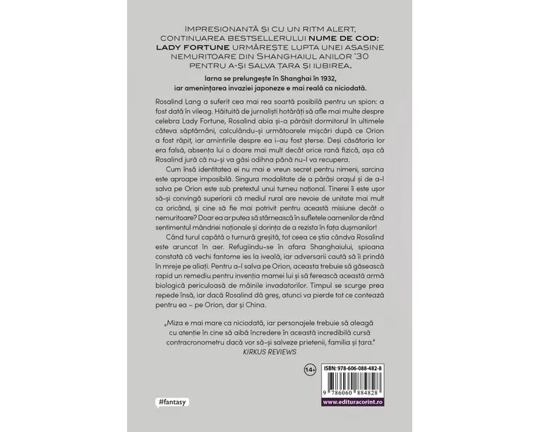 <p><strong>Iarna se prelungeste in Shanghai in 1932, iar amenintarea invaziei japoneze e mai reala ca niciodata.</strong></p> <p><strong> </strong></p> <p>Rosalind Lang a suferit cea mai rea soarta posibila pentru un spion: a fost data in vileag. Haituita de jurnalisti hotarati sa afle mai multe despre celebra Lady Fortune, Rosalind abia si-a parasit dormitorul in ultimele cateva saptamani, calculandu-si urmatoarele miscari dupa ce Orion a fost luat, iar amintirile despre ea i-au fost sterse. Desi casatoria lor a fost falsa, absenta lui o doare mai mult decat orice rana fizica, asa ca Rosalind jura ca nu-si va gasi odihna pana nu-l va recupera.</p> <p>Cum insa identitatea ei nu mai e niciun secret pentru nimeni, sarcina este aproape imposibila. Singura modalitate de a parasi orasul si de a-l salva pe Orion este sub pretextul unui turneu national. Tinerei ii este usor sa-si convinga superiorii ca mediul rural are nevoie de unitate mai mult ca oricand, si cine sa fie mai potrivit pentru aceasta misiune decat o nemuritoare? Doar ea ar putea sa starneasca in sufletele oamenilor de rand sentimentul mandriei nationale si dorinta de a rezista in fata dusmanilor!</p> <p>Cand turul capata o turnura gresita, tot ceea ce stia candva Rosalind este aruncat in aer. Refugiind-se in afara Shanghaiului, spioana constata ca vechi fantome ies la iveala, iar adversarii cauta sa ii prinda in mreje pe aliati. Pentru a-l salva pe Orion, tanara trebuie sa gaseasca rapid un remediu pentru inventia mamei lui si sa fereasca aceasta arma chimica periculoasa de mainile invadatorilor. Timpul se scurge prea repede insa, iar daca Rosalind da gres, atunci va pierde tot ce conteaza pentru ea pe Orion, dar si China.</p> <p> </p> <p>„Miza e mai mare ca niciodata, iar personajele trebuie sa aleaga cu atentie in cine sa aiba incredere in aceasta incredibila cursa contracronometru daca vor sa-si salveze prietenii, familia si tara.” <em>Kirkus Reviews</em></p> <p> </p> <p>„Incheierea geniala a seriei SHANGHAIUL SECRET, cu rasturnari de situatie incredibile si un final care ii va multumi pe deplin pe cititori!” <em>Magical Reads</em></p> <p> </p> <p>„Tradare, lupta si iubire!” <em>Sifa Elizabeth Reads</em></p> <p> </p> <p>„Iubitorii lui Shakespeare (asa, ca mine) vor regasi in aceasta carte elemente care le vor aminti de piesa de teatru Cum va place. Ador faptul ca povestile lui Gong au ca sursa de inspiratie operele lui Shakespeare, dar raman in acelasi timp originale si proaspete.” <em>One Book More</em></p> Produsul cu denumirea Nume de cod: Vanatorul (al doilea volum al seriei „Lady Fortune”) face parte din brandul Corint, se afla in categoria Carti de sanatate si subcategoria