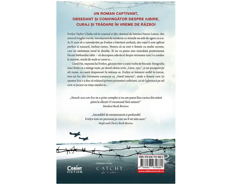 Evelyn Taylor-Clarke sta în scaunul ei la azilul Forest Lawns, aflat în centrul Angliei rurale, înconjurata de rezidenti cu mintile nu atât de brici ca a ei. Ar fi usor sa o consideram pe Evelyn o batrâna zapacita, dar rujul îi este aplicat perfect si nasturii, închisi corect. Pentru ca ea este o femeie cu multe secrete, care îsi aminteste totul în detaliu. Si nu va putea uita niciodata promisiunea facuta barbatului iubit, sa descopere adevarul despre misiunea care l-a condus la moarte, oricât de mult ar costa-o... Când Pat, nepoata lui Evelyn, gaseste într-o veche cutie de biscuiti fotografia unei fetite cu o minge rosie, pe dosul careia scrie „Liese, 1951” si un pasaport pe alt nume, ea cauta raspunsuri la matusa sa. Evelyn se întoarce astfel în trecut, într-un loc din Germania cunoscut ca „Satul interzis”, în care o femeie care îsi spune Eva s-a dus printre prizonieri suferinzi, ca sa-l gaseasca pe cel care s-a jucat cu viata sotului ei... O carte recomandata celor care sunt fani ai romanelor Tatuatorul de la Auschwitz de Heather Moriss, Reteaua Alice de Kate Quinn sau Privighetoarea de Kristin Hannah. „Numele meu este Eva m-a prins complet si nu am putut lasa cartea din mâna pâna la sfârsit! O recomand fara ezitare!” Stardust Book Reviews „Incredibil de emotionanta si profunda! Evelyn este un personaj de care nu îl vei uita usor!” „Ar putea fi noua mea carte favorita!!! Mi-a placut la nebunie premisa eroinei care simuleaza dementa în casa de batrâni ca sa ascunda faptul ca stie despre activitati secrete care tin de evenimente din Al Doilea Razboi Mondial. Ritmul romanului e perfect – m-a tinut cu sufletul la gura pâna la ultima pagina!” Recenzie Goodreads Produsul cu denumirea Numele meu este Eva face parte din brandul Corint, se afla in categoria Carti de sanatate si subcategoria
