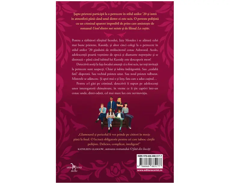 <p>Pentru a sarbatori sfarsitul liceului, Izzy Morales i se alatura celei mai bune prietene, Kassidy, si altor cinci colegi la o petrecere in stilul anilor ’20 gazduita de stralucitorul conac Ashwood. Acolo, adolescentii poarta vesminte de epoca si diamante nepretuite si se distreaza pana cand iubitul lui Kassidy este descoperit mort!</p> <p>Detectivii sositi la fata locului anunta ca a fost ucis, iar toti invitatii la petrecere sunt suspecti. Chiar si iubita indragostita. Sau „cealalta fata” disperata. Sau vechiul prieten uitat. Sau noul prieten tulburat. Misterele se adancesc. Si apoi mai e si Izzy, fata care a adus cutitul…</p> <p>Pentru a-l gasi pe criminal, detectivii ii supun pe adolescenti unor interogatorii chinuitoare, in vreme ce ii tin captivi intr-un conac unde, dintr-odata, cel mai mare lux este nevinovatia.</p> <p> </p> <p>„Glamourul si pericolul ii vor prinde pe cititori in mreje pana la final. O lectura obligatorie pentru cei care iubesc cartile politiste. Delicios, complicat, inteligent!” Kathleen Glasgow, autoarea romanului <em>O fata din bucati</em></p> <p> </p> <p> „<em>O crima neasteptata</em> combina stilul Agathei Christie cu suspansul lui Karen M. McManus in acest captivant roman politist. Muñoz surprinde spiritul thrillerului clasic, tesand cu indemanare firele naratiunii, fara a pierde vreun detaliu important. Un debut de luat in seama al unei voci promitatoare!” <em>Booklist</em></p> <p><em> </em></p> <p>„Pe langa misterul principal, autoarea aduce in discutie in mod inspirat o serie de probleme grave, cum ar fi abuzul de substante toxice, pericolele sexului neprotejat si abuzurile celor care se bucura de privilegii</p> <p>socio-economice. […] Un thriller dulce-amarui pe care nu il mai poti lasa din mana!” <em>Kirkus Reviews</em></p> <p> </p> <p>„In acest roman politist clasic, autoarea debutanta Muñoz vine cu o poveste care te va tine cu sufletul la gura. […] Atentia acordata de Muñoz dinamicii dintre diferite clase sociale, dar si loialitatii, ancoreaza intamplarile in realitate. Strunind cu pricepere tensiunea cu ajutorul unor indicii bine plasate si dialoguri captivante, scriitoarea cultiva in mod credibil</p> <p>dezvaluirile socante si deciziile dificile.” <em>Publishers Weekly</em></p> Produsul cu denumirea O crima neasteptata face parte din brandul Corint, se afla in categoria Carti de sanatate si subcategoria