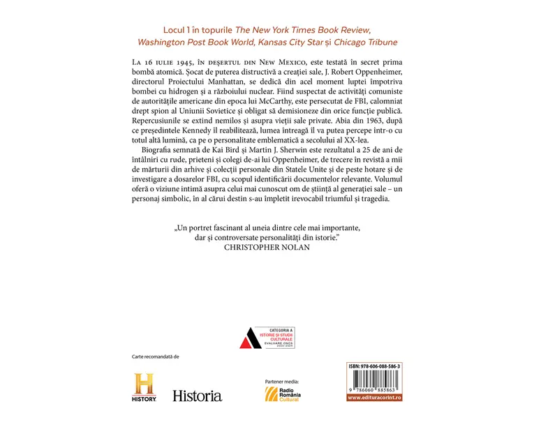 La 16 iulie 1945, in desertul din New Mexico, este testata in secret prima bomba atomica. Socat de puterea distructiva a creatiei sale, J. Robert Oppenheimer, directorul Proiectului Manhattan, se dedica din acel moment luptei impotriva bombei cu hidrogen si a razboiului nuclear. Fiind suspectat de activitati comuniste de autoritatile americane din epoca lui McCarthy, este persecutat de FBI, calomniat drept spion al Uniunii Sovietice si obligat sa demisioneze din orice functie publica. Repercusiunile se extind nemilos si asupra vietii sale private. Abia din 1963, dupa ce presedintele Kennedy il reabiliteaza, lumea intreaga il va putea percepe intr-o cu totul alta lumina, ca pe o personalitate emblematica a secolului al XX-lea. Biografia semnata de Kai Bird si Martin J. Sherwin este rezultatul a 25 de ani de intalniri cu rude, prieteni si colegi de-ai lui Oppenheimer, de trecere in revista a mii de marturii din arhive si colectii personale din Statele Unite si de peste hotare si de investigare a dosarelor FBI, cu scopul identificarii documentelor relevante. Volumul ofera o viziune intima asupra celui mai cunoscut om de stiinta al generatiei sale un personaj simbolic, in al carui destin s-au impletit irevocabil triumful si tragedia. „O carte esentiala!” Time „Se citeste ca un thriller captivant si, pe alocuri, terifiant.” JOHN CAREY, The Sunday Times „O lucrare voluminoasa, de o mare eruditie si luciditate, ce uneste numeroasele fatete ale portretului lui Oppenheimer cu intelegerea exacta a felului sau natural de a fi.” The New York Times „Doi experti in istoria Razboiului Rece si-au unit fortele pentru a spune tulburatoarea si deopotriva extraordinara poveste a lui Robert Oppenheimer.” Foreign Affairs „Cea mai buna carte care s-a scris vreodata despre Oppenheimer!” American Scientist „O relatare magistrala a ascensiunii si a decaderii lui Oppenheimer, plasata in contextul deceniilor turbulente ale transformarii Statelor Unite. Un adevarat tur de forta!” Los Angeles Times Book Review „O capodopera scrisa intr-un stil savant si captivant, care izbuteste sa-i dea viata cu limpezime complicatului si adesea enigmaticului Oppenheimer.” Chicago Tribune Produsul cu denumirea Oppenheimer: un prometeu american face parte din brandul Corint, se afla in categoria Carti de sanatate si subcategoria