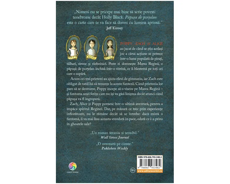 POPPY, ZACH SI ALICE au jucat de când se stiu acelasi joc a carui actiune se petrece într-o lume populata de pirati, tâlhari, sirene si razboinici. Peste ei domneste Marea Regina, o Papusa de portelan închisa într-o vitrina, ce îi blesteama pe toti cei care o supara. Acum, cei trei prieteni au ajuns elevi de gimnaziu, iar Zach este obligat de tatal lui sa renunte la aceste fantezii. Când prietenia lor pare sa se destrame, Poppy începe sa o viseze pe Marea Regina si fantoma unei fetite care nu îsi va gasi linistea decât atunci când Papusa va fi îngropata. Zach, Alice si Poppy pornesc într-o ultima aventura, pentru a împaca spiritul Reginei. Dar, pe masura ce trec prin experiente înfioratoare, nu le ramâne decât sa se întrebe: daca exista o fantoma, îi va mai lasa aceasta vreodata în pace, odata ce i-a prins în ghearele sale? Produsul cu denumirea Papusa de portelan face parte din brandul Corint, se afla in categoria Carti de sanatate si subcategoria