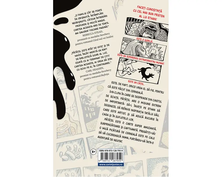 Faceti cunostinta cu cel mai bun prieten al lui Ethan! Este o gorila. Este un supererou extraterestru mutant. Este un catel. Este, de fapt, orice vrea el sa fie, pentru ca este facut din cerneala. Din clipa în care se desprinde din caietul de schite, Patatel are o misiune extrem de importanta: sa-l învete pe Ethan sa deseneze, sa reînvie inspiratia tatalui sau, care este artist, si sa aduca bucurie în casa si în sufletele lor. Patatel este o carte super amuzanta, surprinzatoare si captivanta. Pregatiti-va! O mica picatura de cerneala este pe cale sa va cucereasca inima, purtându-va într-o aventura de neuitat. Familia Rylance se afla într-un impas. Tatal este un creator de benzi desenate devenit faimos datorita seriei despre supereroul mutant Kren, însa când familia este lovita de o tragedie – moartea mamei –, el sufera un blocaj creativ. Fiul sau, Ethan, a promis ca va ilustra un proiect de grup la scoala, însa nu se pricepe deloc la desen, iar fiica cea mica, Sarah, îsi doreste cu încapatânare un catelus. Si tuturor le este foarte dor de mama. Într-o noapte, o pata de cerneala din caietul de schite al domnului Rylance prinde viata si astfel, în casa si în viata familiei îsi face aparitia Patatel. Aceasta mica explozie de creativitate este pe cale sa schimbe totul! Îi va deveni bun prieten lui Ethan, ajutându-l sa-si finalizeze proiectul, pentru Sarah este un catelus adorabil, iar pentru tata este scânteia de creativitate de care avea nevoie pentru un nou roman grafic. Însa ce se va întâmpla când Ethan, Sarah si tatal lor vor fi nevoiti sa se descurce singuri...? „O familie cât se poate de obisnuita, întâmplari neobisnuite, câteva întrebari profunde si multa magie. Cartea aceasta are de toate, am savurat fiecare pagina!” Rebecca Stead, premiata cu medalia Newbery pentru romanul Când ma vei întâlni „Patatel este atât de istet si de haios, încât merita un raft de biblioteca doar al lui. Odata ce ai terminat de citit cartea aceasta, ai vrea sa stai cu ochii pe el în continuare.” Carl Hiassen, premiat cu medalia Newbery pentru romanul Bufnita „Un roman extraordinar!” The New York Times Book Review „O carte formidabila: amuzanta, melancolica si profunda, în acelasi timp. Kenneth Oppel a creat o multime de personaje iesite din comun de-a lungul remarcabilei sale cariere, însa inventivitatea lui ajunge la un cu totul alt nivel cu Patatel – o pata de cerneala plina de viata si de creativitate.” Quill and Quire Produsul cu denumirea Patatel face parte din brandul Corint, se afla in categoria Carti de sanatate si subcategoria