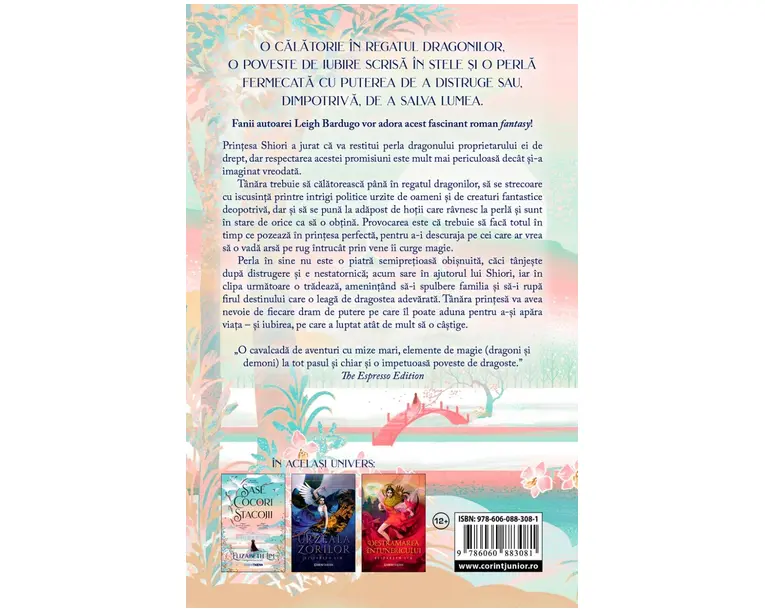 Printesa Shiori a jurat ca va restitui perla dragonului proprietarului ei de drept, dar respectarea acestei promisiuni este mult mai periculoasa decat si-a imaginat vreodata. Tanara trebuie sa calatoreasca pana in regatul dragonilor, sa se strecoare cu iscusinta printre intrigi politice urzite de oameni si de creaturi fantastice deopotriva, dar si sa se puna la adapost de hotii care ravnesc la perla si sunt in stare de orice ca sa o obtina. Provocarea este ca trebuie sa faca totul in timp ce pozeaza in printesa perfecta, pentru a-i descuraja pe cei care ar vrea sa o vada arsa pe rug intrucat prin vene ii curge magie. Perla in sine nu este o piatra semipretioasa obisnuita, caci tanjeste dupa distrugere si e nestatornica; acum sare in ajutorul lui Shiori, iar in clipa urmatoare o tradeaza, amenintand sa-i spulbere familia si sa-i rupa firul destinului care o leaga de dragostea adevarata. Tanara printesa va avea nevoie de fiecare dram de putere pe care il poate aduna pentru a-si apara viata si iubirea, pe care a luptat atat de mult sa o castige. „O cavalcada de aventuri cu mize mari, elemente de magie (dragoni si demoni) la tot pasul si chiar si o impetuoasa poveste de dragoste.” The Espresso Edition „Daca va plac basmele si legendele asiatice, va recomand cu caldura Promisiunea dragonului. Lim si-a creat cu maiestrie propria poveste, tesand in cadrul intrigii fire din cultura orientala. Un roman frumos scris, cu un ritm mai domol, care zugraveste inima unei fete.” Mom with a Reading Problem „Un roman splendid despre ce inseamna sa nu renunti la lucrurile in care crezi, sa faci pace cu trecutul si sa lupti pentru cei pe care ii iubesti.” Culturefly „Cartea aceasta isi tine promisiunea fata de cititorii insetati de povesti de dragoste sincere si de aventuri.” Kirkus Reviews „Scenele de lupta sunt atat de vii, incat pur si simplu tasnesc de pe pagina!” Becky’s Book Blog Produsul cu denumirea Promisiunea dragonului (Vol.2 din seria Sase cocori stacojii) face parte din brandul Corint, se afla in categoria Carti de sanatate si subcategoria