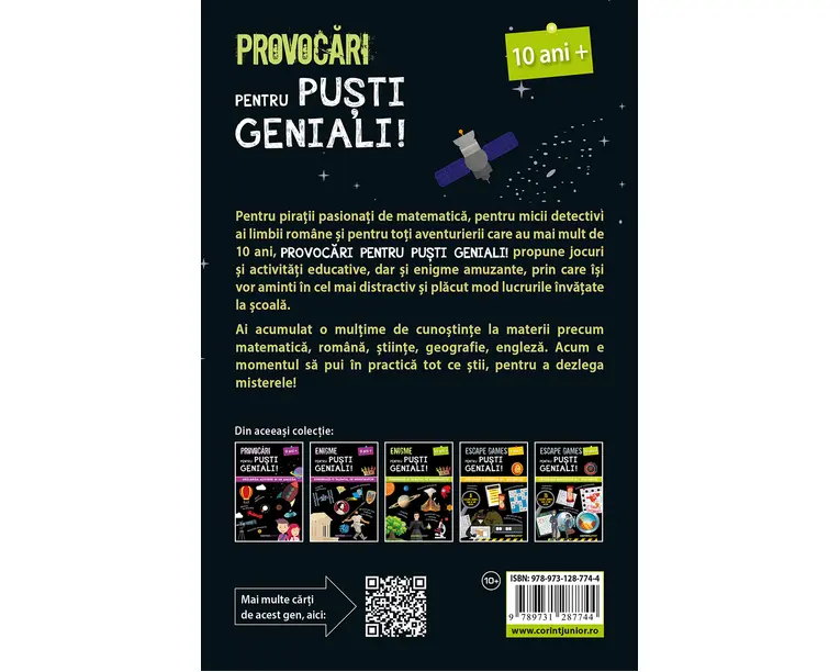 Pentru piratii pasionati de matematica, pentru micii detectivi ai limbii române si pentru toti aventurierii care au mai mult de 10 ani, Provocari pentru pusti geniali! propune jocuri si activitati educative, dar si enigme amuzante, prin care îsi vor aminti în cel mai distractiv si placut mod lucrurile învatate la scoala. Ai acumulat o multime de cunostinte la materii precum matematica, româna, stiintele, geografia, engleza. Acum e momentul sa pui în practica tot ce stii, pentru a dezlega misterele! O carticica bogata în activitati distractive si educative, în care varietatea jocurilor (careuri de cuvinte, sudoku, exercitii de completat, mici anchete pe baza unor indicii, labirinturi, mesaje cifrate) este întrecuta doar de grafica prietenoasa, de culorile vii si de ilustratiile haioase. Fiecare activitate ajuta copilul sa foloseasca si sa-si împrospateze cunostintele dobândite la scoala: operatii matematice, notiuni de biologie si de geografie, vocabularul limbii engleze, gramatica si ortografia limbii române, deductii logice si multe altele. Produsul cu denumirea Provocari pentru pusti geniali 10 ani face parte din brandul Corint, se afla in categoria Carti de sanatate si subcategoria