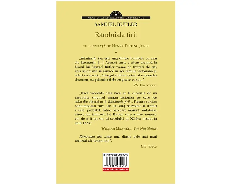 <p>Colectia Clasici ai literaturii universale va ofera o noua capodopera a altor vremuri: <i>R</i><i>ânduiala firii</i> de Samuel Butler.</p> <p>„<i>Rânduiala firii </i>este una dintre bombele cu ceas ale literaturii. [...] Aceasta carte a zacut ascunsa în biroul lui Samuel Butler vreme de treizeci de ani, abia asteptând sa arunce în aer familia victoriana si, odata cu aceasta, întregul edificiu maret al romanului victorian, cu pilastrii sai de sustinere cu tot...” V.S. Pritchett</p> <p>„Daca vreodata casa mea ar fi cuprinsa de un incendiu, singurul roman victorian pe care l-as salva din flacari ar fi <i>Rânduiala firii... </i>Fiecare scriitor contemporan care are un simt dezvoltat al ironiei îi este, probabil, într-o oarecare masura, îndatorat, direct sau indirect, lui Butler, care a avut nenorocul de a fi un om al secolului al XX-lea nascut în anul 1835.” William Maxwell, <i>T</i><i>he </i><i>N</i><i>ew </i><i>Y</i><i>orker</i></p> Produsul cu denumirea Randuiala firii face parte din brandul Corint, se afla in categoria Carti de sanatate si subcategoria