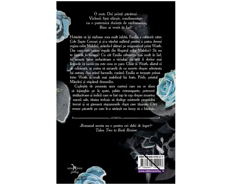 Hotarata sa isi razbune sora mult iubita, Emilia a calatorit catre Cele Sapte Cercuri si si-a vandut sufletul pentru a putea deveni regina celor Malefici, avandu-l alaturi pe enigmaticul print Wrath. Dar care este prima regula din Regatul celor Malefici? Sa nu te increzi in nimeni! Cu cat Emilia zaboveste mai mult in Iad, in aceasta lume seducatoare a viciului, cu atat ii devine mai limpede ca nimic nu este ceea ce pare. Chiar si Wrath, aliatul ei de odinioara, ar putea sa tainuiasca anumite secrete legate de adevarata lui natura. Prin urmare, curand, Emilia se trezeste prinsa intre Wrath si mult mai maleficul lui frate, Pride, printul Casei Mandriei si stapanul demonilor. Coplesita de prezenta unor curteni care nu se sfiesc sa injunghie pe la spate, de palate extravagante, petreceri stralucitoare si indicii care se bat cap in cap despre moartea surorii sale, tanara trebuie sa dezlege misterele propriului trecut si sa gaseasca raspunsurile dupa care tanjeste. Cata vreme pacatele pe care le-a savarsit nu incep sa o bantuie. „Romanul acesta nu e pentru cei slabi de inger!” Takes Two to Book Review „Daca esti in cautarea unei povesti cu multa tensiune sexuala/dragoste, elemente dark fantasy si teme precum razbunarea, atunci cartea asta ar putea fi pe gustul tau!” Takes Two to Book Review „Simt ca romanul acesta deschide calea catre un final neasteptat si captivant. Ard de nerabdare sa descopar ce urmeaza sa se intample! […] Regatul celor Malefici a fost pe gustul meu, dar Regatul celor Blestemati mi-a placut inca si mai mult!” Heavenly Bookish „Un stil incantator, magic, care te ajuta sa calatoresti in timp. O poveste palpitanta, cu rasturnari de situatie la fiecare pas, care il imping pe cititor sa intre in jocul anticiparii, dornic sa isi dea seama ce il asteapta la pagina urmatoare.” Mel to the Any Produsul cu denumirea Regatul celor Blestemati face parte din brandul Corint, se afla in categoria Carti de sanatate si subcategoria