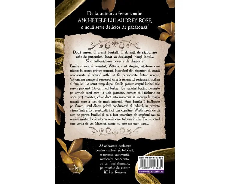 Emilia si sora ei geamana, Vittoria, sunt streghe, vrajitoare care traiesc in secret printre oameni, incercand din rasputeri sa treaca neobservate si evitand astfel sa fie persecutate. Intr-o noapte, Vittoria nu ajunge sa serveasca cina la renumitul restaurant sicilian al familiei. La scurt timp dupa, Emilia gaseste corpul iubitei sale surori profanat intr-un mod barbar. Cu sufletul bucati, porneste pe urmele celui care i-a ucis geamana, dornica sa-i razbune cu orice pret moartea, chiar daca asta inseamna sa recurga la magia neagra, care a fost de mult interzisa. Apoi Emilia il intalneste pe Wrath, unul dintre printii conducatori ai Iadului, in privinta caruia insa a fost avertizata inca din copilarie. Wrath pretinde ca este de partea Emiliei si ca a fost insarcinat de stapanul sau sa rezolve misterul crimelor in serie care tulbura insula. Totusi, cand vine vorba de cei Malefici, nimic nu este asa cum pare… „O adevarata desfatare pentru simturi si, totodata, o poveste captivanta, meticulos conceputa, cu un final dramatic, pe muchie de cutit.” Kirkus Reviews „Scriitura plina de lirism si atmosfera coplesitoare dau farmec unei lumi temeinic construite, care isi are radacinile in fermecatorul Palermo al secolului al XIX-lea, evocat in special prin intermediul preparatelor culinare din restaurantul familiei, in timp ce rasturnarile de situatie complet imprevizibile intregesc romanul.” Publishers Weekly „Personajele sunt extrem de detaliat desenate; felul in care autoarea construieste lumea din poveste este inteligent si are la baza evenimente istorice infuzate cu magie, iar intriga naucitoare iti va ramane in minte. Gastronomia, dramele de familie, magia si roman-tismul se impletesc in acest roman dinamic, palpitant, minunat si plin de atmosfera.” Booklist Produsul cu denumirea Regatul celor Malefici (hardcover) face parte din brandul Corint, se afla in categoria Carti de sanatate si subcategoria