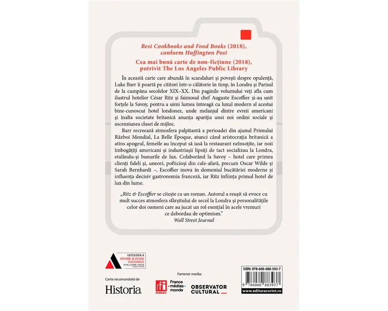 Best Cookbooks and Food Books (2018), conform Huffington Post; Cea mai buna carte de non-fictiune (2018), potrivit The Los Angeles Public Library In aceasta carte care abunda in scandaluri si povesti despre opulenta, Luke Barr ii poarta pe cititori intr-o calatorie in timp, in Londra si Parisul de la cumpana secolelor XIXXX. Din paginile volumului veti afla cum ilustrul hotelier César Ritz si faimosul chef Auguste Escoffier si-au unit fortele la Savoy, pentru a uimi lumea intreaga cu luxul modern al acestui bine-cunoscut hotel londonez, unde melanjul dintre evreii americani si inalta societate britanica anunta aparitia unei noi ordini sociale si ascensiunea clasei de mijloc. Barr recreeaza atmosfera palpitanta a perioadei din ajunul Primului Razboi Mondial, La Belle Époque, atunci cand aristocratia britanica a atins apogeul, femeile au inceput sa iasa la restaurant neinsotite, iar noii imbogatiti americani si industriasii lipsiti de tact socializau la Londra, etalandu-si bunurile de lux. Colaborand la Savoy hotel care primea clienti fideli si, uneori, pofticiosi din cale-afara, precum Oscar Wilde si Sarah Bernhardt , Escoffier inova in domeniul bucatariei moderne si influenta decisiv gastronomia franceza, iar Ritz infiinta primul hotel de lux din lume. „Ritz & Escoffier se citeste ca un roman. Autorul a reusit sa evoce cu mult succes atmosfera sfarsitului de secol la Londra si personalitatile celor doi oameni care au jucat un rol esential in acele vremuri ce debordau de optimism.” Wall Street Journal „A fost Ritz primul «influencer», asa cum se spune in prezent? «Negustor» de visuri la sfarsit de Epoca Victoriana, el nu a fost doar fondatorul cosmopolitismului de tip nou, ci si vestitorul hotelurilor ca «mod de viata» si a mancarii ca manifestare a culturii populare.” Toronto Star „Un stil alert si o documentare impecabila. [...] O carte savuroasa despre un episod definitoriu pentru istoria culinara.” Publishers Weekly „[O] relatare plina de viata, presarata cu multe anecdote, nu doar o dubla biografie ce curge usor, ci si o istorie incitanta despre un moment de cotitura din evolutia industriei hotelurilor si restaurantelor.” Booklist „Cand mancati Peach Melba sau cand beti Grand Marnier, ar trebui sa le multumiti lui Ritz si Escoffier, pentru ca ei le-au denumit astfel, iar apoi le-au popularizat.” The Economist Produsul cu denumirea Ritz si Escoffier. Hotelierul, maestrul bucatar si ascensiunea clasei de lux face parte din brandul Corint, se afla in categoria Carti de sanatate si subcategoria
