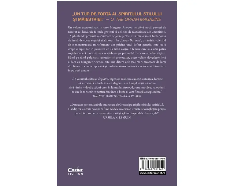 Un volum extraordinar, in care Margaret Atwood ne ofera noua povesti de neuitat ce dezvaluie fatetele grotesti si delicios de rautacioase ale umanitatii. „Alphinland”, prima dintre cele trei texte independente din volum, prezinta o scriitoare de fantasy calauzita intr-o seara furtunoasa de iarna de vocea sotului ei raposat. In „Lusus Naturae”, o tanara, suferind de o monstruoasa transformare din pricina unui defect genetic, este luata drept vampir. Iar in povestea ce da titlul cartii, o femeie care si-a ucis patru soti descopera o ocazie de a se razbuna pe primul barbat care a nedreptatit-o. Rand pe rand palpitant, amuzant si provocator, acest volum dovedeste inca o data ca Margaret Atwood este una dintre cele mai mari creatoare de lumi din literatura contemporana si o observatoare incisiva a celor mai intunecate impulsuri umane. „Un tur de forta al spiritului, stilului si maiestriei.” O, The Oprah Magazine „In volumul Salteaua de piatra, ingenios si adesea caustic, autoarea doreste sa surprinda felurile in care alegem, de-a lungul vietii, sa iubim si sa ranim doua actiuni care, in lumea lui Atwood, sunt intotdeauna optiuni ce duc la consecinte pentru care intr-o buna zi vom fi trasi la raspundere.” The New York Times Book Review „Danseaza peste mlastinile intunecate ale Groazei pe aripile spiritului satiric [...]. Ganditi-va la aceste povesti ca fiind acadele cu arsenic, urmate de o inghetata prajita pudrata cu antrax, toate servite cu stil si aplomb impecabile. Savurati-le!” Ursula K. Le Guin „Un volum surprinzator de tulburator si captivant, dar in acelasi timp plin de umor taios. Isi atinge tinta laudabila: asemenea miturilor, povestile din aceasta selectie dureaza dincolo de timp. Sunt atemporale, memorabile si, pur si simplu, placute la lectura.” Chicago Tribune „O carte puternica... Extraordinara... Realismul si ridicolul, ludicul si seriozitatea sunt mentinute intr-un fin echilibru pe tot parcursul textelor.” The Guardian „Aceste noua povesti le sunt datoare povestilor din toate timpurile. Numind «poveste» o fictiune scurta, o scoatem, macar putintel, din sfera muncilor si zilelor mundane, deoarece evoca astfel lumea povestilor populare, a basmelor minunate si a povestitorilor de demult. Putem presupune fara sa gresim ca toate povestile sunt fictiuni, in timp ce o «naratiune» poate fi o poveste adevarata despre ceea ce convenim de obicei sa numim «viata reala», dar si o povestire ce se mentine in limitele realismului social. Batranul Marinar spune o poveste. «Dati‑mi un banut de arama si va voi spune o poveste de aur», ii placea sa zica regretatului Robertson Davies.” Margaret Atwood Produsul cu denumirea Salteaua de piatra. Noua povesti malitioase face parte din brandul Corint, se afla in categoria Carti de sanatate si subcategoria
