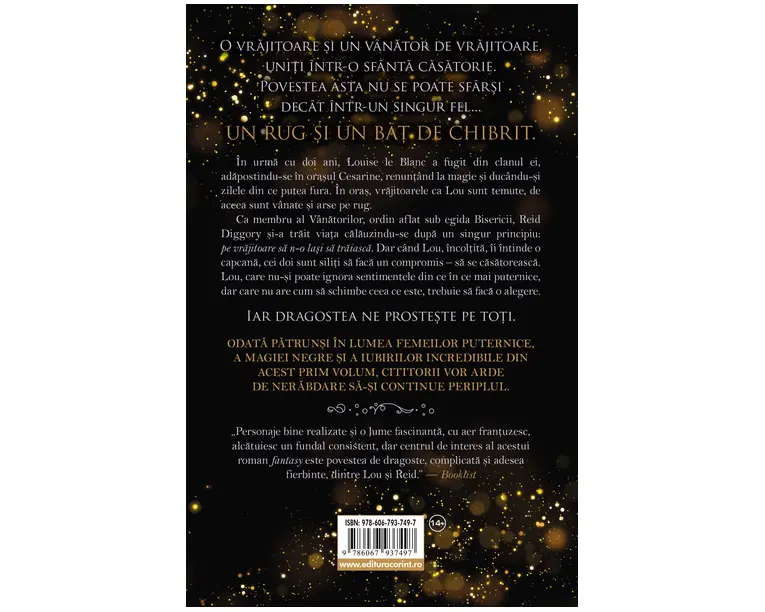 În urma cu doi ani, Louise le Blanc a fugit din clanul ei de vrajitoare, adapostindu-se în orasul Cesarine, renuntând la magie si ducându-si zilele din ce putea fura. În oras, vrajitoarele ca Lou sunt temute, de aceea sunt vânate si arse pe rug. Ca membru al Vânatorilor, ordin sub egida Bisericii, Reid Diggory si-a trait viata calauzindu-se dupa un singur principiu: pe vrajitoare sa n-o lasi sa traiasca. Dar când Lou, încoltita, îi întinde o capcana, cei doi sunt siliti la un compromis imposibil – sa se casatoreasca. Lou, care nu-si poate ignora sentimentele din ce în ce mai puternice, totusi neavând cum sa schimbe ceea ce este, trebuie sa faca o alegere. Iar dragostea ne prosteste pe toti. DOI UNITI CA UNUL, PENTRU A SE IUBI, A SE ONORA SAU A ARDE. ODATA PATRUNSI ÎN LUMEA FEMEILOR PUTERNICE, A MAGIEI NEGRE SI A IUBIRILOR INCREDIBILE DIN ACEST PRIM VOLUM, CITITORII VOR ARDE DE NERABDARE SA-SI CONTINUE PERIPLUL. „Personaje bine realizate si o lume plurivalenta, cu aer frantuzesc, alcatuiesc un fundal consistent, dar centrul de interes al acestui roman fantasy este povestea de dragoste, complicata si adesea fierbinte, dintre Lou si Reid.” — Booklist „Un debut de exceptie, plin de tot ce îmi place mai mult: o eroina plina de vioiciune si bine portretizata, un sistem complex si mortal de magie si o poveste de dragoste arzatoare, care m-a facut sa citesc pâna târziu în noapte. Sarpe si porumbel este o bijuterie de carte.” — Sarah J. Maas, autoarea seriei Tronul de clestar „Îi va vraji pe fanii povestilor de dragoste.” — Kirkus Reviews „Mahurin a reluat tema vrajitoarei si a vânatorului de vrajitoare, reîmprospatând-o. Lumea construita de ea o sa-i atraga pe cititori, iar firea puternica, dar melancolica a eroinei Lou o sa-i tina captivi în lectura.” — School Library Journal „Musteste de intriga si fiori.” — Bulletin of the Center for Children’s Books Produsul cu denumirea Sarpe & porumbel face parte din brandul Corint, se afla in categoria Fantasy si subcategoria