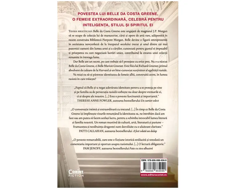 Bestseller The New York Times La douazeci si ceva de ani, Belle da Costa Greene este angajata de magnatul J.P. Morgan sa se ocupe de colectia lui de manuscrise, carti si opere de arta rare, adapostita in recent construita Biblioteca Pierpont Morgan. Belle devine o figura omniprezenta in societatea newyorkeza si unul dintre cei mai puternici oameni din lumea artei si a cartilor, cunoscuta pentru gustul ei impecabil si priceperea cu care negociaza lucrari unice, contribuind la crearea unei colectii renumite in intreaga lume. Dar Belle are un secret, pe care trebuie sa-l protejeze cu orice pret. Nu s-a nascut Belle da Costa Greene, ci Belle Marion Greener. Este fiica lui Richard Greener, primul absolvent de culoare de la Harvard si un bine-cunoscut sustinator al egalitatii rasiale. Va reusi ea sa-si pastreze identitatea de femeie alba, construita atent, in lumea rasista in care traieste? ,,Captivanta, emotionanta si incarcata de tensiune. Secretul dureros al lui Belle si curajul ei admirabil te vor cuceri si iti vor frange inima.” FIONA DAVIS, autoarea bestsellerului Leii de pe Fifth Avenue ,,Faptul ca Belle si-a negat adevarata identitate pentru a se proteja pe sine si pe familia sa de persecutia rasiala vorbeste nu doar despre vremurile ei, ci si despre ale noastre. [...] Este o poveste fascinanta si importanta.” THERESE ANNE FOWLER, autoarea bestsellerului Un cartier select ,,O conversatie intima si extraordinara cu trecutul. […] In timp ce Belle da Costa Greene isi implineste visurile renuntand la identitatea sa, ne intrebam daca am face sau am putea sa facem acelasi lucru, pentru a schimba irevocabil lumea literara si familia noastra. Un roman saturat de cultura, arta, literatura si pasiune frumusetea si nesabuinta dragostei sunt dezvaluite cu o uluitoare claritate.” PATTI CALLAHAN, autoarea bestsellerului A fost odata un dulap ,,O poveste extraordinara, care este o fictiune istorica stralucita si totodata un comentariu important si oportun asupra rasismului. […] O lectura obligatorie.” PAM JENOFF, autoarea bestsellerului Fata cu stea albastra ,,Rodul unei documentari minutioase, o carte sfasietoare si plina de inspiratie Greene […], o perspectiva fascinanta asupra unei figuri publice care a dus o lupta profunda, a carei poveste rezoneaza inca si astazi, cu o putere si o pregnanta surprinzatoare.” KRISTIN HARMEL, autoarea bestsellerului Cartea copiilor pierduti ,,Cu o scriitura la fel de bogata in detalii precum coplesitoarea lume a artei si a literaturii in fruntea careia s-a aflat Belle da Costa Greene […], o lectura incantatoare, in care te afunzi si te pierzi, si deopotriva un portret intim, tulburator si viu al vietii personale si profesionale a lui Belle.” CHANEL CLEETON, autoarea bestsellerului Cand am plecat din Cuba Produsul cu denumirea Secretul bibliotecarei face parte din brandul Corint, se afla in categoria Carti de sanatate si subcategoria
