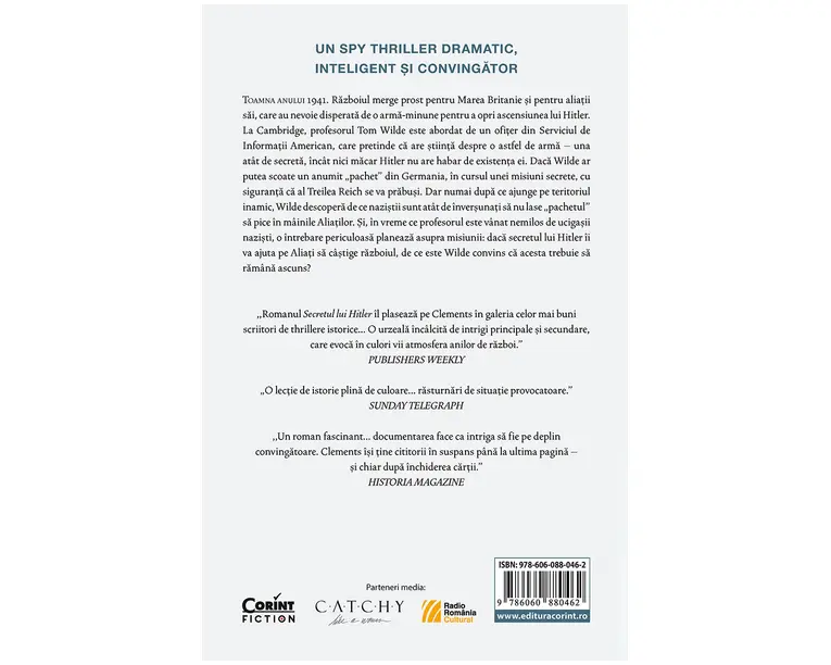 Toamna anului 1941. Razboiul merge prost pentru Marea Britanie si aliatii sai, care au nevoie disperata de o arma-minune pentru a opri ascensiunea lui Hitler. La Cambridge, profesorul Tom Wilde este abordat de un ofiter din Serviciul de Informatii American, care pretinde ca are stiinta despre o astfel de arma una atat de secreta, incat nici macar Hitler nu are habar de existenta ei. Daca Wilde ar putea scoate un anumit „pachet” din Germania, in cursul unei misiuni secrete, cu siguranta cel de-al Treilea Reich se va prabusi. Dar numai atunci cand se afla pe teritoriul inamic, Wilde descopera de ce nazistii sunt atat de inversunati sa nu lase „pachetul” sa pice in mainile Aliatilor. Si, in vreme ce profesorul este vanat nemilos de ucigasii nazisti, o intrebare periculoasa planeaza asupra misiunii: daca secretul lui Hitler ii va ajuta pe Aliati sa castige razboiul, de ce este Wilde convins ca acesta trebuie sa ramana ascuns? ,,Romanul il plaseaza pe Clements in galerial celor mai buni scriitori de thriller istoric... O urzeala incalcita de intrigi principale si secundare care evoca in culori vii atmosfera anilor de razboi.” PUBLISHER’S WEEKLY „O lectie de istorie plina de culoare . . . rasturnari de situatie provocatoare.” SUNDAY TELEGRAPH ,,Un roman fascinant... documentarea face ca intriga sa fie pe deplin convingatoare. Clements isi tine cititorii in suspans pana la ultima pagina si chiar dupa inchiderea cartii.” HISTORIA MAGAZINE ,,Thrillerul de spionaj al lui Rory Clements, a carui actiune se desfasoara la inceputul anilor 1940, evoca o perioada de polarizare politica, neincredere si violenta mocnita.” THE TIMES Produsul cu denumirea Secretul lui Hitler face parte din brandul Corint, se afla in categoria Carti de sanatate si subcategoria