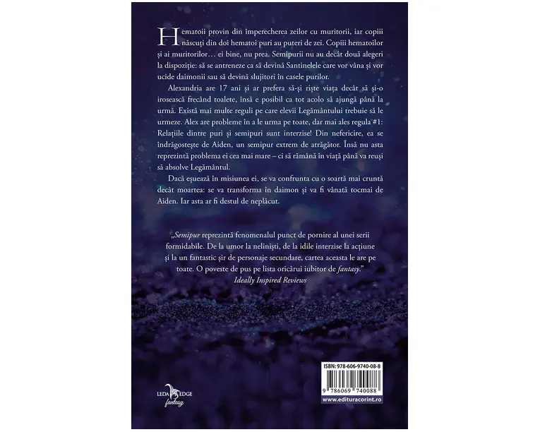 Hematoii provin din imperecherea zeilor cu muritorii, iar copiii nascuti din doi hematoi puri au puteri de zei. Copiii hematoilor si ai muritorilor… ei bine, nu prea. Semipurii nu au decat doua alegeri la dispozitie: sa se antreneze ca sa devina Santinelele care vor vana si vor ucide daimonii sau sa devina slujitori in casele purilor. Alexandria are 17 ani si ar prefera sa-si riste viata decat sa si-o iroseasca frecand toalete, insa e posibil ca tot acolo sa ajunga pana la urma. Exista mai multe reguli pe care elevii Legamantului trebuie sa le urmeze. Alex are probleme in a le urma pe toate, dar mai ales regula #1: Relatiile dintre puri si semipuri sunt interzise! Din nefericire, ea se indragosteste de Aiden, un semipur extrem de atragator. Insa nu asta reprezinta problema ei cea mai mare ci sa ramana in viata pana va reusi sa absolve Legamantul. Daca esueaza in misiunea ei, se va confrunta cu o soarta mai crunta decat moartea: se va transforma in daimon si va fi vanata tocmai de Aiden. Iar asta ar fi destul de neplacut. „Semipur reprezinta fenomenalul punct de pornire al unei serii formidabile. De la umor la nelinisti, de la idile interzise la actiune si la un fantastic sir de personaje secundare, cartea aceasta le are pe toate. O poveste de pus pe lista oricarui iubitor de fantasy.” Ideally Inspired Reviews Produsul cu denumirea Semipur (vol.1 din seria Legamantul) face parte din brandul Corint, se afla in categoria Carti de sanatate si subcategoria