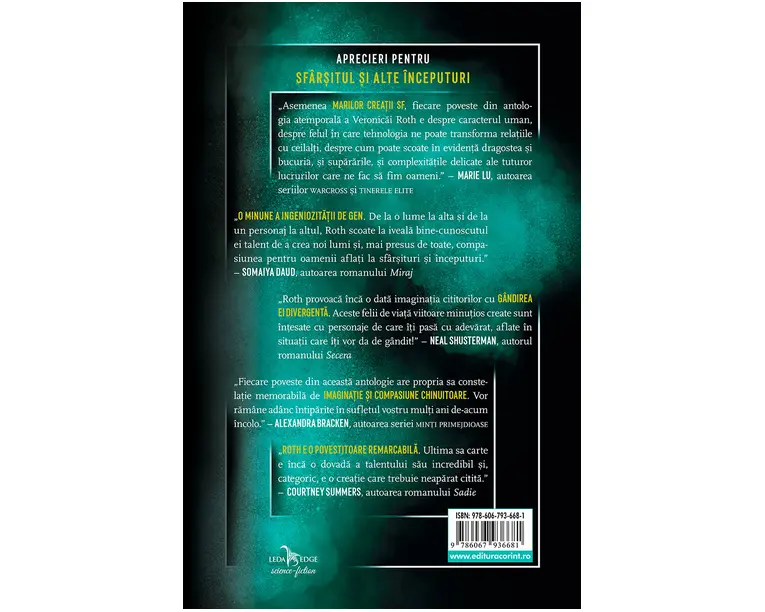 NICIO LUME NU SE ASEAMANA CU ALTA. În aceasta antologie captivanta, fiecare decor e mai straniu si mai minunat decât anteriorul, întesat de fiinte fascinante si tehnologii noi. Si cu toate progresele de care se bucura aceste lumi futuriste, oamenii înca se confrunta cu probleme extrem de umane. În INERTIE, Claire si Matt nu-si mai vorbesc. În urma unui grav accident de masina, Matt solicita o procedura care le îngaduie sa retraiasca amintirile pe care le-au împartasit – si le ofera sansa de a descoperi ce n-a mers bine. Atleigh Kent, protagonista povestirii TORCATOARELE, urmareste si ucide lipitori – o rasa extraterestra pradatoare care ia în stapânire ilegal trupuri-gazda umane. Însa moartea naste moarte, iar Atleigh doreste cu orice pret sa se razbune. Închipuiti-va o simfonie unica, o oda lenta a durerilor si a bucuriilor, note create de fiecare trup în timp ce traieste si moare. În ASCULTATORII, aceste cântece pot fi auzite numai de câtiva oameni. Când Darya ia o decizie dificila între rolul ei de arhivar de cântece de viata sau de cântece de moarte, tânara descopera unde se îmbina cele doua. VIM SI VIGOR exploreaza fanatismul, anxietatea si prietenia dintre femei prin alegerea lui Edie de a folosi Protocolul Elucidarii, o tehnologie de realitate simulata care dezvaluie cele mai plauzibile rezultate ale unor decizii dificile. „Asemenea MARILOR CREATII SF, fiecare poveste din antologia atemporala a Veronicai Roth e despre caracterul uman, despre felul în care tehnologia ne poate transforma relatiile cu ceilalti, despre cum poate scoate în evidenta dragostea, bucuria, supararile si complexitatile delicate ale tuturor lucrurilor care ne fac sa fim oameni.” – MARIE LU, autoarea seriilor WARCROSS si TINERELE ELITE „O MINUNE A INGENIOZITATII DE GEN. De la o lume la alta si de la un personaj la altul, Roth scoate la iveala bine-cunoscutul ei talent de a crea noi lumi si, mai presus de toate, compasiunea pentru oamenii aflati la sfârsituri si începuturi.” – SOMAIYA DAUD, autoarea romanului Miraj „Roth provoaca înca o data imaginatia cititorilor cu GÂNDIREA EI DIVERGENTA. Aceste felii de viata viitoare minutios create sunt întesate cu personaje de care îti pasa cu adevarat, aflate în situatii care îti vor da de gândit!” – NEAL SHUSTERMAN, autorul romanului Secera „Fiecare poveste din aceasta antologie are propria sa constelatie memorabila de IMAGINATIE SI COMPASIUNE CHINUITOARE. Vor ramâne adânc întiparite în sufletul vostru multi ani de-acum încolo.” – ALEXANDRA BRACKEN, autoarea seriei MINTI PRIMEJDIOASE „ROTH E O POVESTITOARE REMARCABILA. Ultima sa carte e înca o dovada a talentului sau incredibil si, categoric, e o creatie care trebuie neaparat citita.” –COURTNEY SUMMERS, autoarea romanului Sadie Produsul cu denumirea Sfarsitul si alte inceputuri. Povesti din viitor face parte din brandul Corint, se afla in categoria Carti de sanatate si subcategoria