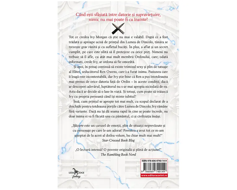 Cand esti sfasiata intre datorie si supravietuire, nimic nu mai poate fi ca inainte! Tot ce credea Ivy Morgan ca stie nu mai e valabil. Dupa ce a fost tradata si aproape ucisa de printul din Lumea de Dincolo, tanara se trezeste grav ranita si cu sufletul bucati. In plus, a aflat si un secret cumplit, pe care este silita sa il protejeze cu orice pret. Nimeni nu trebuie sa il afle, cu atat mai mult membrii Ordinului, care, odata informati, crede Ivy, ar ordona sa fie omorata. Si apoi, in peisaj continua sa existe trimisul sexy si plin de tatuaje al Elitei, seducatorul Ren Owens, care i-a furat inima. Pasiunea care ii leaga este incontestabila, dar Ivy stie bine ca Ren a pus intotdeauna mai presus de orice datoria fata de Ordin in aceste conditii, daca ar descoperi adevarul, luptatorul nu s-ar mai apropia niciodata de ea. Asta daca ar decide sa o lase in viaţa. Si totusi, cum poate sa traiasca Ivy cu propria persoana cand isi minte iubitul? Insa, cum printul se apropie tot mai mult, cu scopul declarat de a deschide pentru totdeauna portile catre Lumea de Dincolo, Ivy ramane fara variante. Daca nu isi da seama rapid in cine se poate increde, nu doar inima ei va fi facuta una cu pamantul, ci si civilizatia insasi. „Sfasiere este un carusel de emotii, plin de situatii neprevazute si cu personaje pe care le-am adorat! Povestea a avut tot ce m-am asteptat de la acest al doilea volum, ba chiar mult mai mult!” „O lectura intensa! O poveste originala si plina de actiune!” The Rambling Book Nerd Star-Crossed Book Blog Produsul cu denumirea Sfasiere (al doilea volum al seriei Wicked) face parte din brandul Corint, se afla in categoria Jennifer l si subcategoria Armentrout