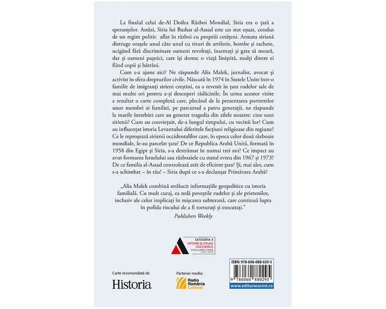 La finalul celui de-Al Doilea Razboi Mondial, Siria era o tara a sperantelor. Astazi, Siria lui Bashar al-Assad este un stat esuat, condus de un regim politic aflat în razboi cu propriii cetateni. Armata siriana distruge orasele unul câte unul cu tiruri de artilerie, bombe si rachete, ucigând fara discriminare oameni revoltati, înarmati si gata sa moara, dar si oameni pasnici, care îsi doresc o viata linistita, multi dintre ei fiind copii si batrâni. Cum s-a ajuns aici? Ne raspunde Alia Malek, jurnalist, avocat si activist în sfera drepturilor civile. Nascuta în 1978 în Statele Unite într-o familie de imigranti sirieni crestini, ea a revenit în tara rudelor sale de mai multe ori pentru a-si descoperi radacinile. În urma acestor vizite a rezultat o carte complexa care, plecând de la prezentarea portretelor unor membri ai familiei, pe parcursul a patru generatii, ne raspunde la marile întrebari care au generat tragedia din zilele noastre: cine sunt sirienii? Cum au convietuit, de-a lungul timpului, cu vecinii lor? Cum au influentat istoria Levantului diferitele factiuni religioase din regiune? Ce le reproseaza sirienii occidentalilor care, în epoca celor doua razboaie mondiale, le-au parcelat tara? De ce Republica Araba Unita, formata în 1958 din Egipt si Siria, s-a destramat în numai trei ani? Ce impact au avut formarea Israelului sau razboaiele cu statul evreu din 1967 si 1973? De ce familia al-Assad controleaza atât de eficient tara? Si, mai ales, cum s-a schimbat – în rau! – Siria dupa ce s-a declansat Primavara Araba? „Alia Malek combina stralucit informatiile geopolitice cu istoria familiala. Cu mult curaj, ea reda povestile rudelor si ale prietenilor, inclusiv ale celor implicati în miscarea subterana, care continua lupta în pofida riscului de a fi torturati si executati. ˮ Publishers Weekly „Relatarea lui Malek surprinde în mod însufletit personalitatile rudelor sale si ale prietenilor, precum si propriile impresii, permitând cititorilor sa descopere mizele unui razboi actual.ˮLAURA CHANOUX, Booklist „Alia Malek a scris o lectura patrunzatoare si obligatorie, ce ne lumineaza si ne ajuta sa întelegem oamenii din spatele crizei siriene.ˮ The Toronto Star Produsul cu denumirea Siria. Tara care ne-a fost casa face parte din brandul Corint, se afla in categoria Carti de sanatate si subcategoria