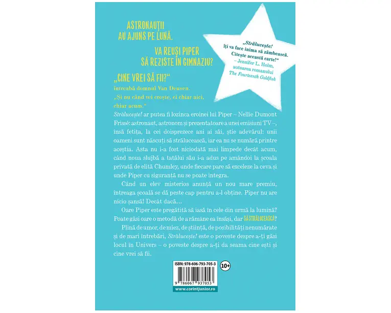 Straluceste! ar putea fi lozinca eroinei lui Piper – Nellie Dumont Frissé: astronaut, astronom si prezentatoare a unei emisiuni TV –, însa fetita, la cei doisprezece ani ai sai, stie adevarul: unii oameni sunt nascuti sa straluceasca, iar ea nu se numara printre acestia. Asta nu i-a fost niciodata mai limpede decât acum, când noua slujba a tatalui sau i-a adus pe amândoi la scoala privata de elita Chumley, unde fiecare pare sa exceleze la ceva si unde Piper cu siguranta nu se poate integra. Când un elev misterios anunta un nou mare premiu, întreaga scoala se da peste cap pentru a-l obtine. Piper nu are nicio sansa! Decât daca… Oare Piper este pregatita sa iasa în cele din urma la lumina? Poate gasi oare o metoda de a ramâne ea însasi, dar SA STRALUCEASCA? Plina de umor, de miez, de stiinta, de posibilitati nenumarate si de mari întrebari, Straluceste! este o poveste despre a-ti gasi locul în Univers – o poveste despre a-ti da seama cine esti si cine vrei sa fii. „Straluceste! îti va face inima sa zâmbeasca. Citeste aceasta carte!“ – Jennifer L. Holm, autoarea romanului The Fourteenth Goldfish „O aducere-aminte a faptului ca nimic nu este mai important decât sa fii prieten si sa fii tu însuti.“ REBECCA STEAD, laureata a Newbery Medal, autoarea romanului Când ma vei întâlni „Aceasta poveste încurajatoare despre descoperirea de sine celebreaza prietenia, bunatatea si împlinirea potentialului.“ Publishers Weekly „Aceasta carte delicata ne reaminteste ca bunatatea, generozitatea si iubirea sunt mai importante decât banii, premiile si prestigiul.“ Booklist „Mesajul puternic despre forta de a fi bun va fi încurajator pentru cititori, iar fanii seriei Biblioteca domnului Lemoncello se vor bucura de alt tip de puzzle.“ School Library Journal Produsul cu denumirea Straluceste! face parte din brandul Corint, se afla in categoria Carti de sanatate si subcategoria
