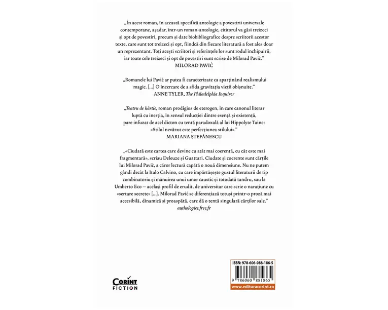 Un „roman-antologie” alcatuit din 38 de povestiri ale unor scriitori fictivi, carora li se dau si scurte notite biobibliografice inventate. Fiecare autor este dintr-una din tarile in care opera lui Pavić a fost tradusa. Volumul este gandit ca o antologie a literaturii lumii, reflectand atat spiritul literaturii locale, cat si stilul unic al creatiei paviciene. Este inclusiv o povestire scrisa de un autor roman, Ion Opulescu, despre o aristocrata care a existat cu adevarat, Natalia Chesco, casatorita cu Milan I al Serbiei. Povestirile contin „sertare” secrete care te indeamna sa cercetezi, sa gandesti, sa faci legatura intre personaje, adesea ca un cititor-detectiv, dar care cauta indicii in literatura. O alta povestire este despre un „fotoliu de murire” in care, daca te asezai, iti pierdeai viata. Un fotoliu care ajunge la diferite persoane, de-a lungul anilor, de la un capitan de vas la un negustor de antichitati, pastrandu-si misterul. In alta, aflam cum cantecul pasarelelor dintr-un parc parizian ascunde numele unui criminal care, cu secole in urma, rapise pe nedrept onoare si viata femeii cu care era insurat. „Romanele lui Pavić ar putea fi caracterizate ca apartinand realismului magic. […] O incercare de a sfida gravitatia vietii obisnuite.” Anne Tyler, The Philadelphia Inquirer „Teatru de hartie, roman prodigios de eterogen, in care canonul literar lupta cu inerţia, in sensul reducţiei dintre esenţa şi existenţa, pare infuzat de acel dicton cu tenta paradoxala al lui Hippolyte Taine: «Stilul nevazut este perfecţiunea stilului».” Mariana Stefanescu „«Ciudata este cartea care devine cu atat mai coerenta, cu cat este mai fragmentara», scriau Deleuze si Guattari. Ciudate si coerente sunt cartile lui Milorad Pavić, a caror lectura capata o noua dimensiune. Nu ne putem gandi decat la Italo Calvino, cu care impartaseste gustul literaturii combinatorii si manuirea unui umor caustic si totodata tandru, sau la Umberto Eco acelasi profil de erudit, de universitar care scrie o naratiune cu «sertare secrete» […]. Milorad Pavić se diferentiaza totusi printr-o proza mult mai accesibila, rapida si proaspata, care da o tenta singulara cartilor sale.” authologies.free.frnn „Fiecare nou roman al lui Milorad Pavić talmacit la noi de aceeaşi traducatoare şi cunoscatoare a lumii paviciene, Mariana Ştefanescu, este o sarbatoare, aşteptata indelung, degustata pe indelete, reluata iar şi iar. Daca pentru cititor romanul este o piatra de incercare, se pot doar ghici şi intui cate dificultaţi ii pune celui ce-l descifreaza, ii palpeaza legaturile subterane, ii depisteaza reţeaua cu noduri formate din cuvinte-cheie ca sa-l incifreze in limba romana.nInsa Milorad Pavić este mai mult decat innoitorul romanului contemporan. Cine are dorinţa, curiozitatea şi ragazul sa-i exploreze bibliografia poate descoperi opera unui creator uriaş: un istoric literar dublat de un eseist şi convieţuind cu un scriitor total a debutat ca poet, s-a format in spaţiul prozei scurte, a trecut la roman, alternand cele doua formule epice, a experimentat apoi şi in dramaturgie.” Elisabeta Lasconi Produsul cu denumirea Teatru de hartie face parte din brandul Corint, se afla in categoria Carti de sanatate si subcategoria