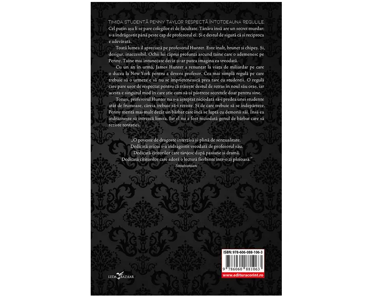TIMIDA STUDENTA Penny Taylor respecta intotdeauna regulile. Cel putin aşa li se pare colegilor ei de facultate. Tanara insa are un secret murdar: s-a indragostit pana peste cap de profesorul ei. Si e destul de sigura ca si reciproca e adevarata. Toata lumea il apreciaza pe profesorul Hunter. Este inalt, brunet si chipes. Si, desigur, inaccesibil. Ochii lui caprui profunzi ascund taine care o ademenesc pe Penny. Taine mai intunecate decat si-ar putea imagina ea vreodata. Cu un an in urma, James Hunter a renuntat la viata de miliardar pe care o ducea la New York pentru a deveni profesor. Cea mai simpla regula pe care trebuie sa o urmeze e sa nu se imprieteneasca prea tare cu studentii. O regula care pare usor de respectat pentru ca traieste destul de retras in noul sau oras, iar acesta e singurul mod in care stie cum sa-si pastreze secretele doar pentru sine. Totusi, profesorul Hunter nu s-a asteptat niciodata sa-i predea unei studente atat de frumoase, careia trebuie sa-i reziste. Si de care trebuie sa se indeparteze. Penny merita mai mult decat un barbat care inca se lupta cu demonii sai. Insa ea indrazneşte sa intreaca limita. Iar el nu a fost niciodata genul de barbat care sa reziste tentatiei. „O poveste de dragoste interzisa si plina de senzualitate. Dedicata oricui s-a indragostit vreodata de profesorul sau. Dedicata cititorilor care tanjesc dupa pasiune si drama. Dedicata cititorilor care adora o lectura fierbinte intr-o zi ploioasa.” Smutsonian „Profesorul Hunter frange multe inimi! Bogat, misterios, superb si inaccesibil. Pot sa inteleg cum de o fata si-ar putea pierde mintile in fata unui astfel de barbat perfect.” Smutsonian „M-am indragostit nebuneste de profesorul Hunter de cum a intrat in poveste! Am adorat cuplul Penny-James si i-am tinut pumnii pe tot parcursul romanului. Imperfectiunile protagonistilor i-au facut perfecti. Conexiunea lor si tensiunea aproape ca au iesit din pagini, invaluindu-ma.” Lina’s Reviews „Nu ratati acest roman! I-am acordat intregii serii cinci stele. Recomand cu caldura! Ivy are un mod senzational de a scrie si de a modela fiecare personaj din povestile ei. Merita sa le cititi!” Inspired by a Book Produsul cu denumirea Tentatie (primul volum din seria Hunter) face parte din brandul Corint, se afla in categoria Carti de sanatate si subcategoria
